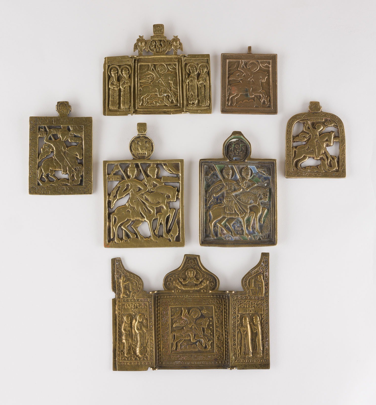A COLLECTION OF SEVEN BRASS ICONS DEPICTING STS. BORIS AND GLEB AS WELL AS ST. GEORGE KILLING THE DRAGON Russian,17th-19th century Cast in relief, partially four-colour enamelled. Enamel part. chipped. 7.7-13.8 cm high.