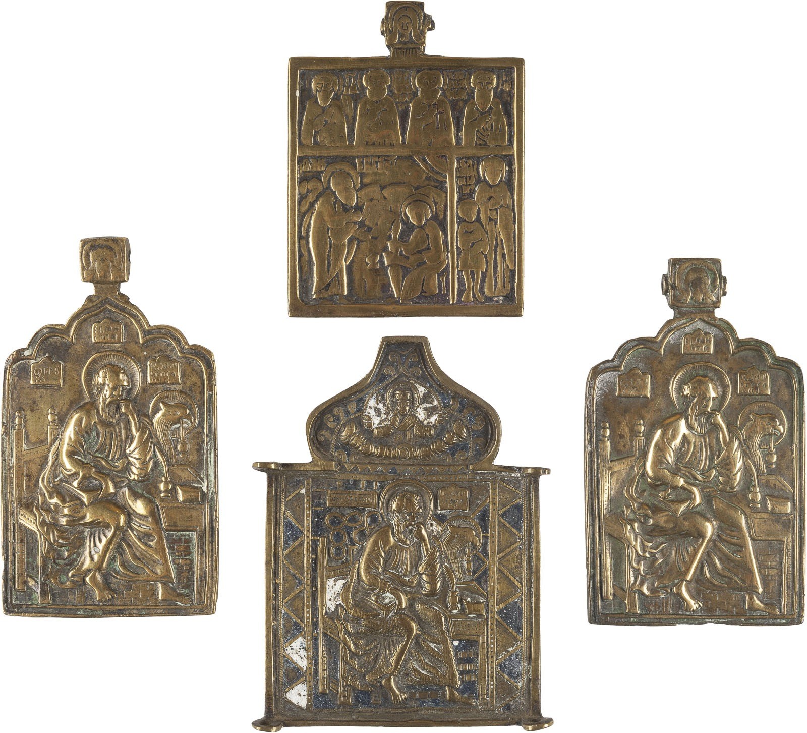 A COLLECTION OF FOUR BRASS ICONS DEPICTING ST. JOHN THE EVANGELIST ON THE PATMOS ISLAND AND ST. JOHN, THEOLOGIAN IN SILENCE Russian, 18th century Cast in relief, partially enamelled in blue and white. Enamel chipped. 8.8-11.1 cm high.