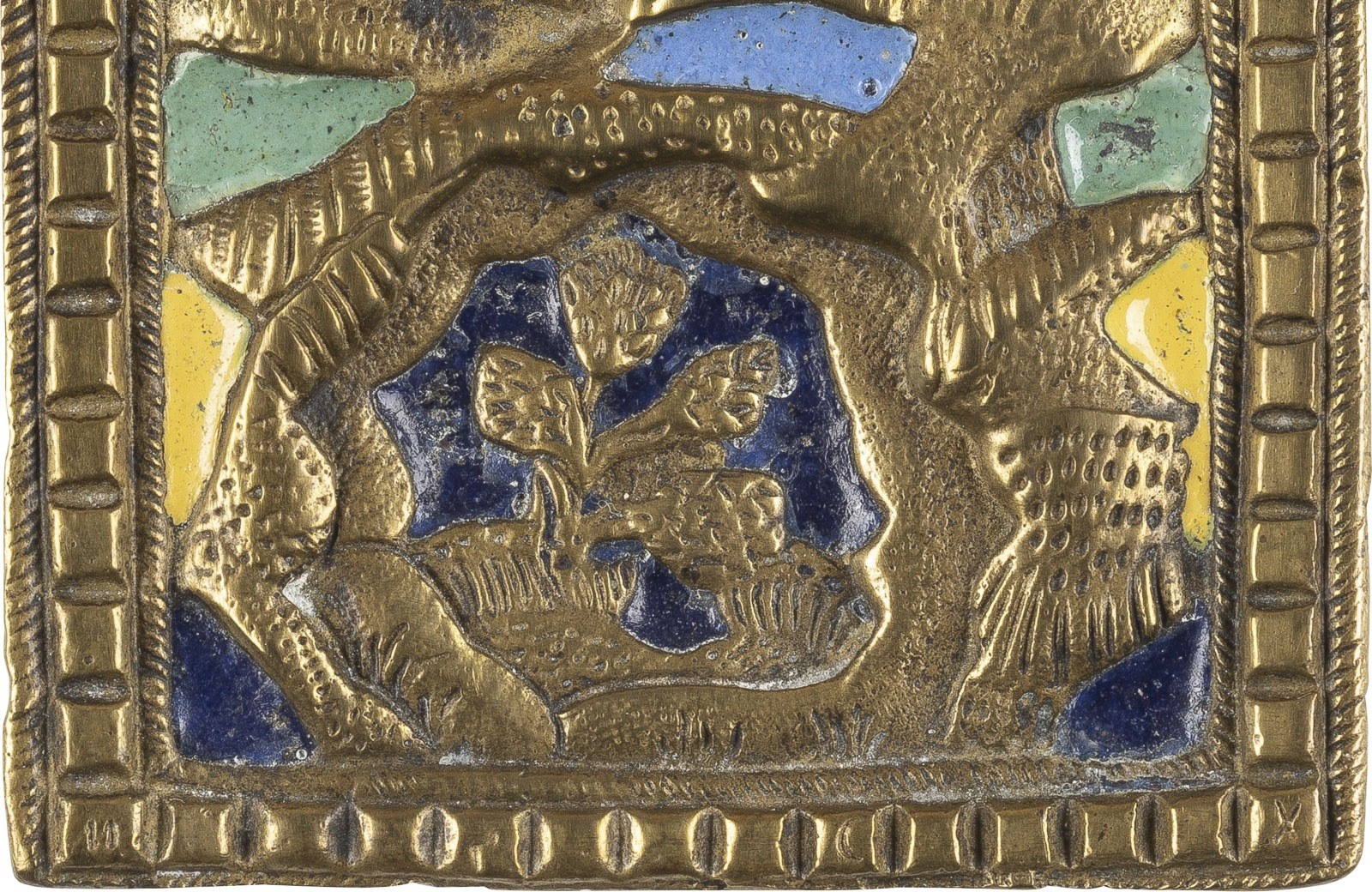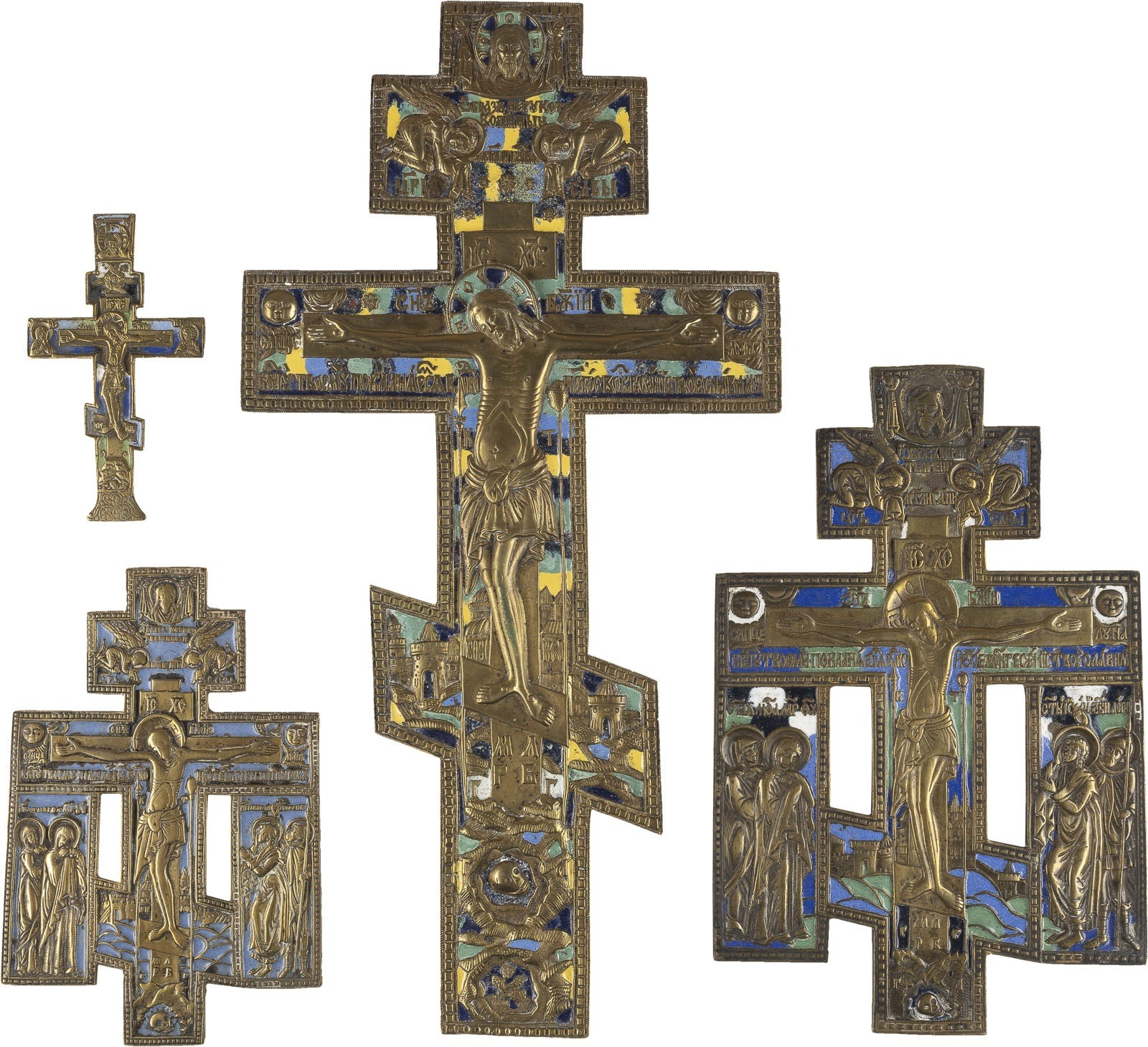 A COLLECTION OF FOUR BRASS AND ENAMEL ICONS INCLUDING A SIGNED LARGE CROSS AND THREE CRUCIFIXES Russian, a.o. Rodion Semyonovich Khrustalev, 19th century Cast in relief, multi-coloured enamelled. A large crucifix signed in Cyrillic on lower margin 'M.R.S.Kh.'. Enamel part. chipped. 11-36.1 cm high.