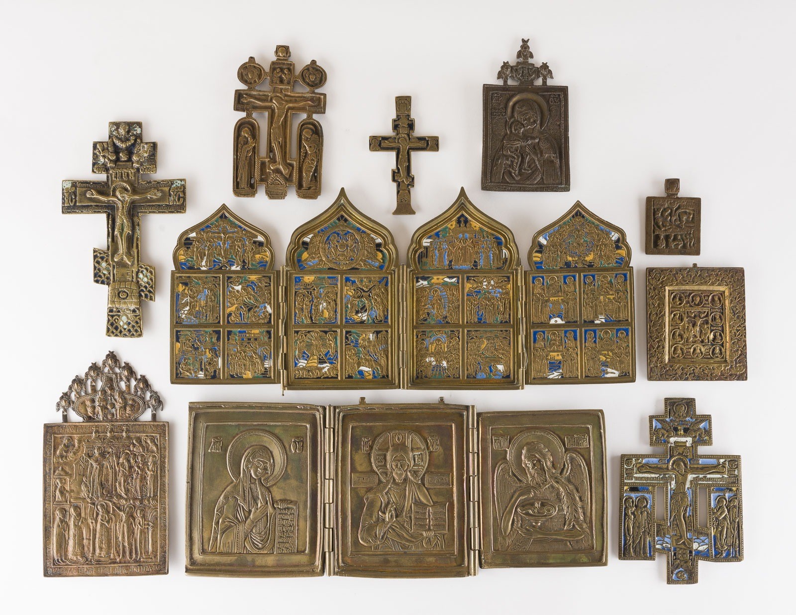 A COLLECTION OF TEN BRASS ICONS DEPICTING IMAGES OF CHRIST AND THE MOTHER OF GOD AS WELL AS LITURGICAL FEASTS Russian, 16th-19th century Cast in relief, partially multi-coloured enamelled. Enamel part. chipped, one Crucifix with missing parts in cast. 7-20.1 cm high.