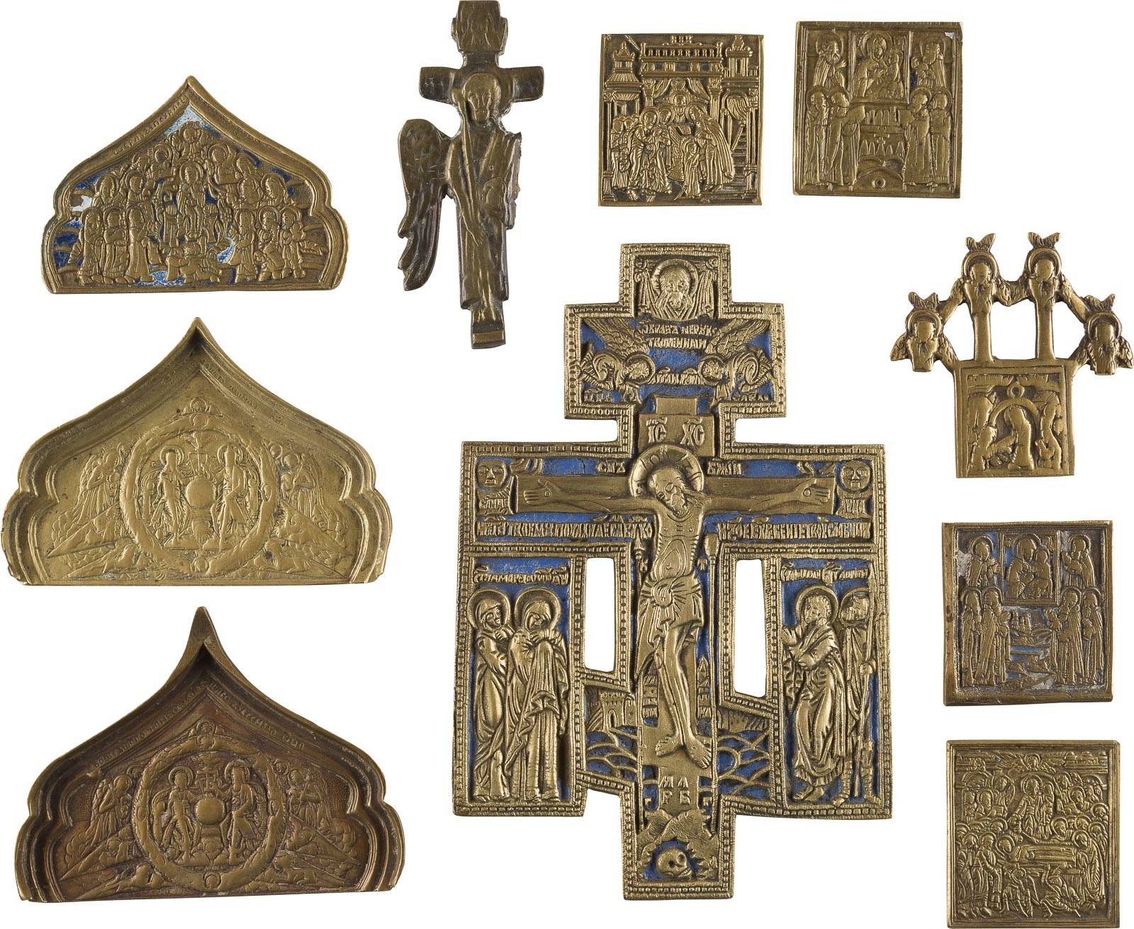 A COLLECTION OF TEN BRASS ICONS INCLUDING CROSSES AND FRAGMENTS DEPICTING LITURGICAL FEASTS AND SELECTED SAINTS Russian, 19th/20th century Cast in relief, partially blue or white enamelled. Enamel part. chipped, one wing of an angel missing. 4.5-16.4 cm high.