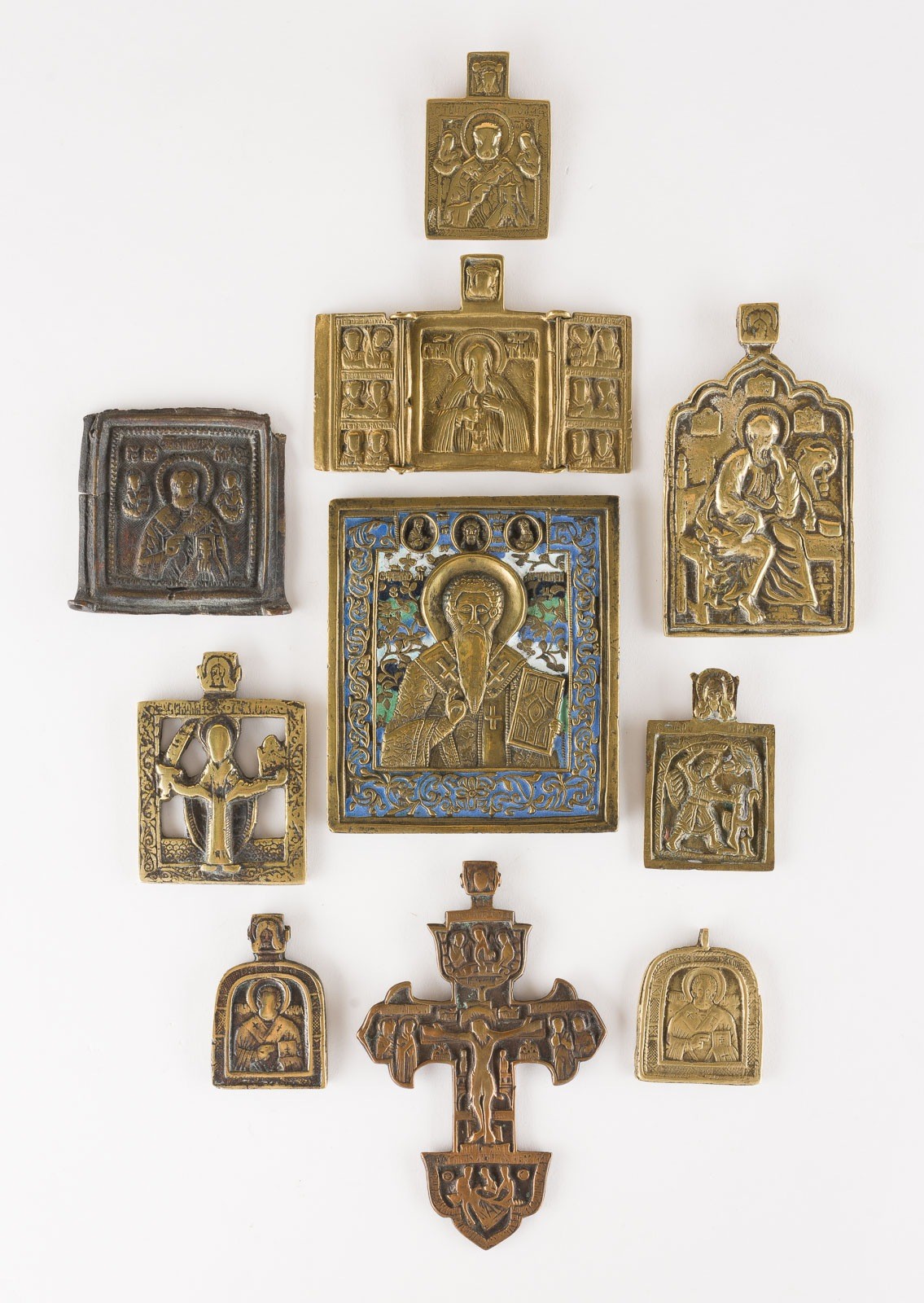 A COLLECTION OF TEN BRASS ICONS DEPICTING CRUCIFIX AND SELECTED SAINTS Russian, 17th-19th century Cast in relief, partially four-colour enamelled. Enamel min. chipped, wings of one triptych missing. 5-12.4 cm high.