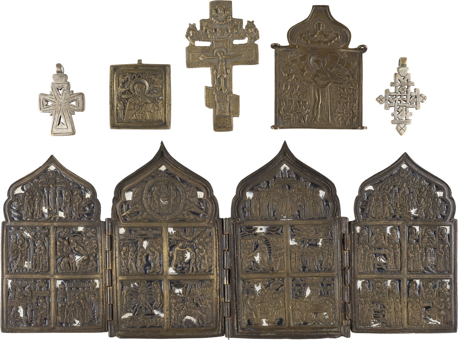 A COLLECTION OF TWO COPTIC CROSSES AND FOUR BRASS ICONS: CRUCIFIX, THE MOTHER OF GOD 'JOY TO ALL WHO GRIEVE', ST. NICHOLAS OF MYRA AND LITURGICAL FEASTS Ethiopian/Russian, 18th/19th century Cast in relief, partially enamelled in blue and white. Enamel part. chipped. 6.2-17.2 cm high.