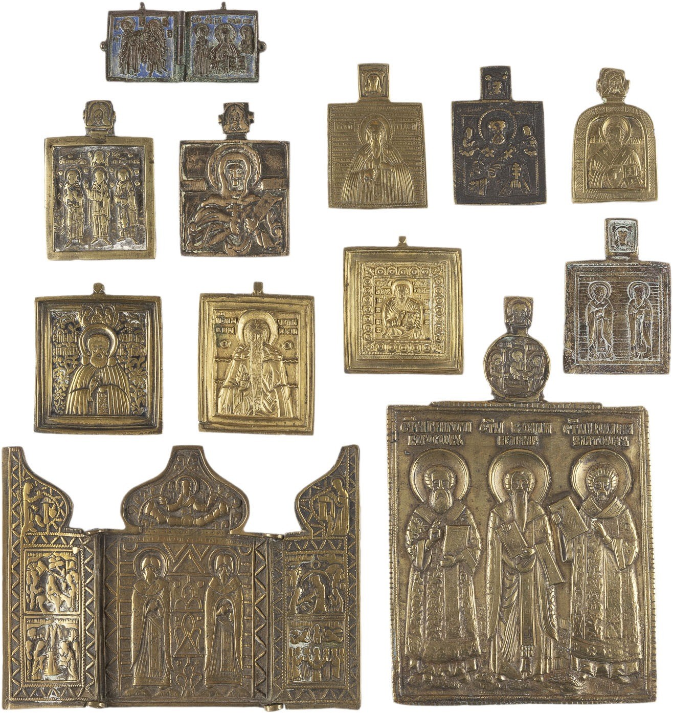 A COLLECTION OF TWELVE BRASS ICONS DEPICTING SELECTED SAINTS Russian, 17th-19th century Cast in relief, partially enamelled in Blue. Enamel chipped. 3.5-16.7 cm high.