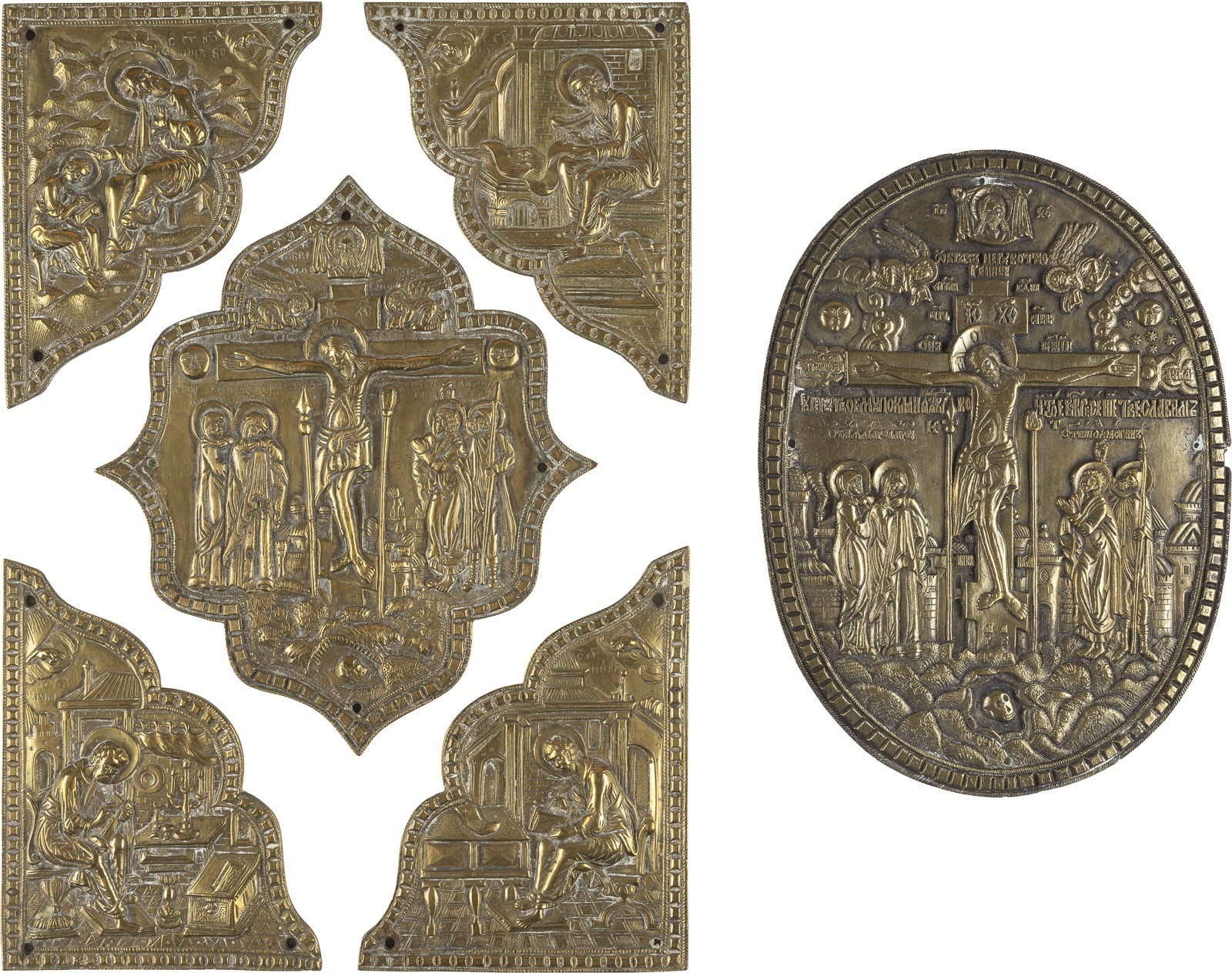 SIX BRASS PLAQUES OF BOOKS OF GOSPELS DEPICTING CRICIFIXION AND THE EVANGELISTS Russian, 19th century Cast in relief. 11.8-17.9 cm high.