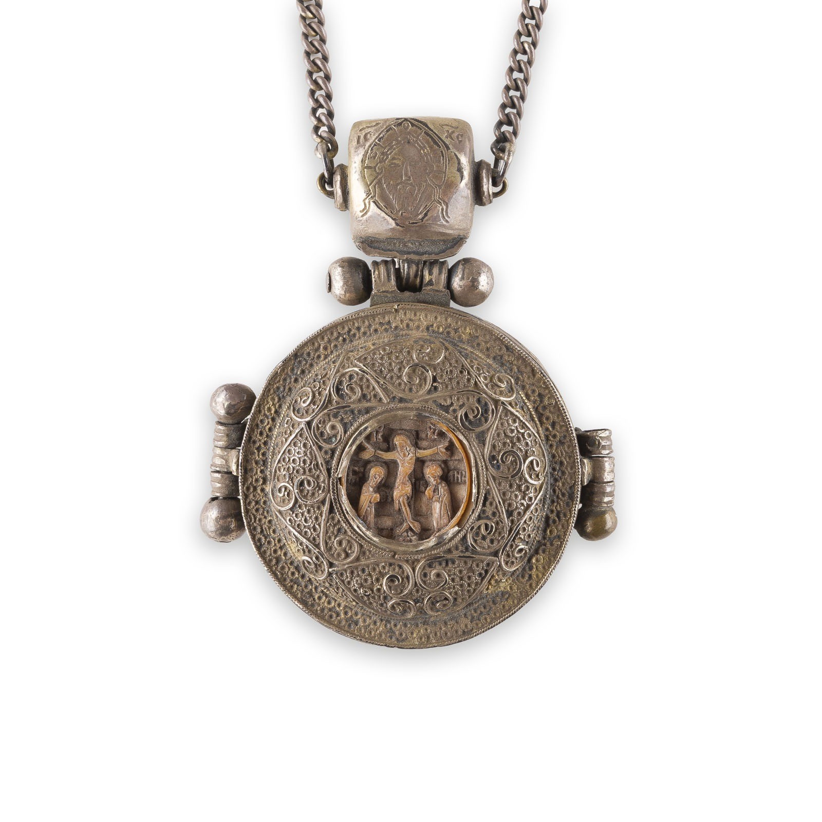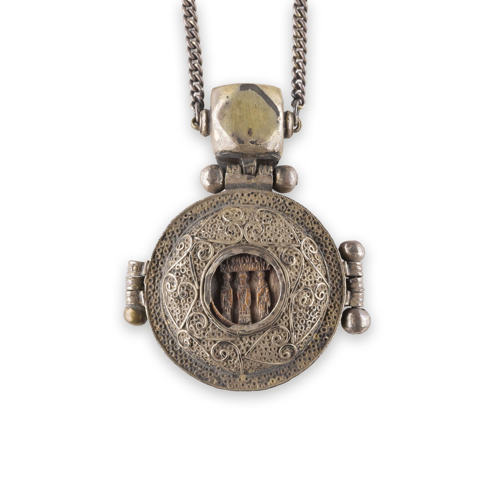 A VERY FINE METAL-GILT PANHAGIA SHOWING THE CRUCIFIXION, THE MOTHER OF GOD OF THE SIGN, THE OLD TESTAMENT TRINITY AND THREE SAINTS Russian, 16th century Metal-gilt filigree body, bone carved in miniatures. 6 cm long.