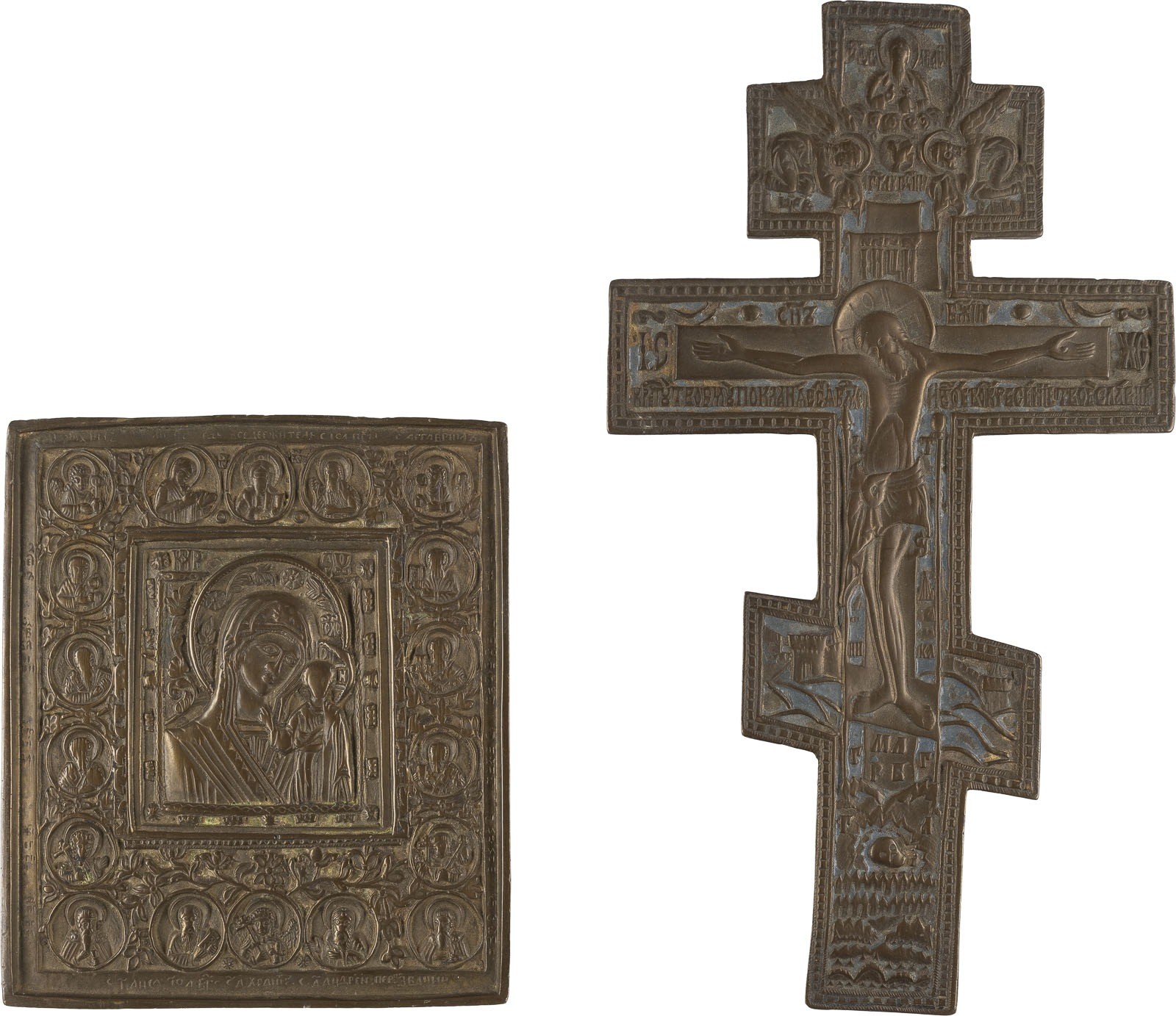 TWO BRASS ICONS DEPICTING CRICIFIX AND THE KAZANSKAYA MOTHER OF GOD Russian, 18th/19th century Cast in relief, partially enamelled in blue. Enamel chipped. 14.5/24.8 cm high.