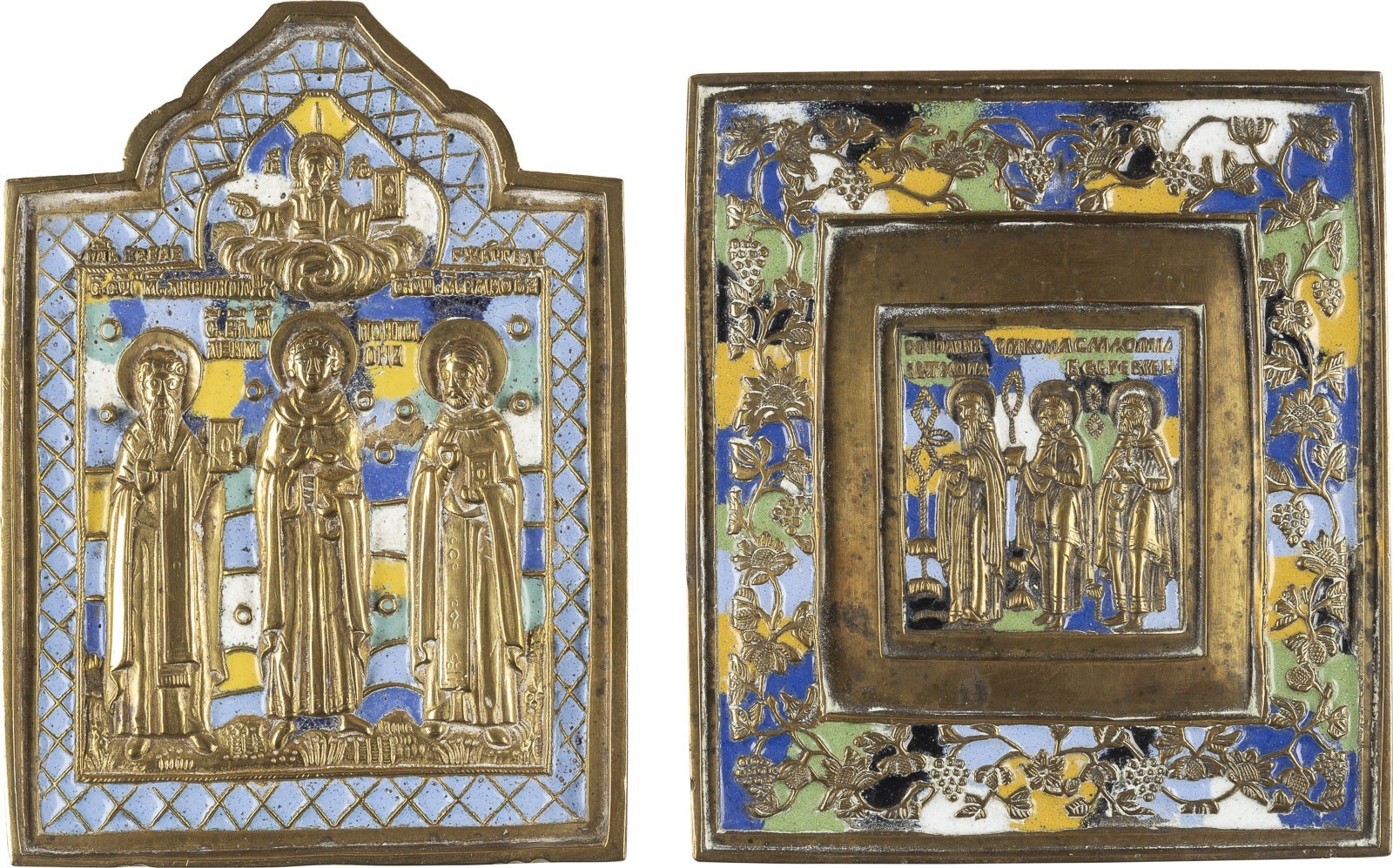 TWO BRASS AND ENAMEL ICONS DEPICTING SELECTED SAINTS Russian, 19th century Cast in relief, six-colour enamelled. Enamel very slightly chipped. 11.6/12.8 cm high.