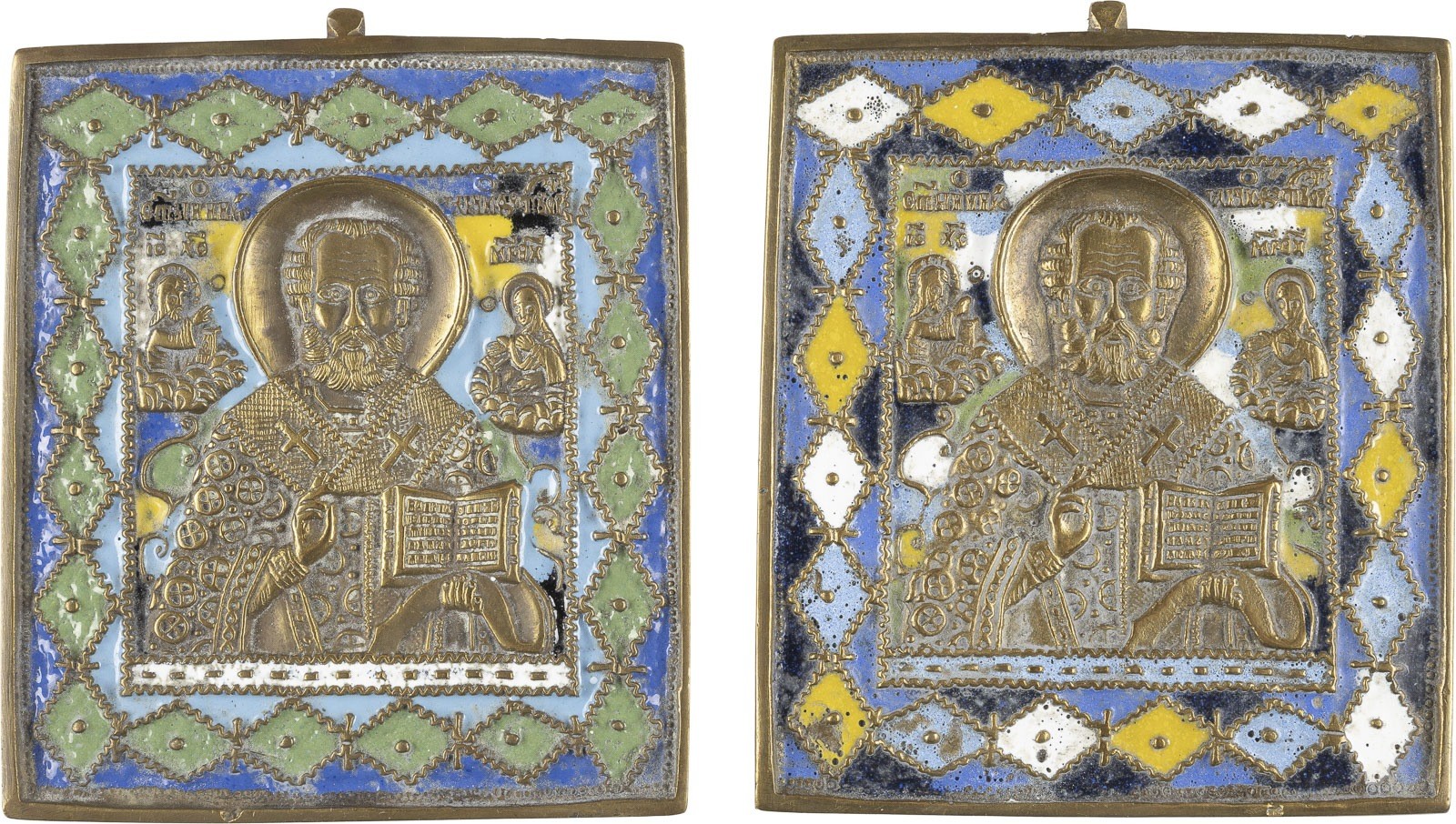 TWO BRASS AND ENAMEL ICONS SHOWING ST. NICHOLAS OF MYRA Russian, 19th century Cast in relief, six-colour enamelled. Enamel very slightly chipped. Each 11.3 cm high.
