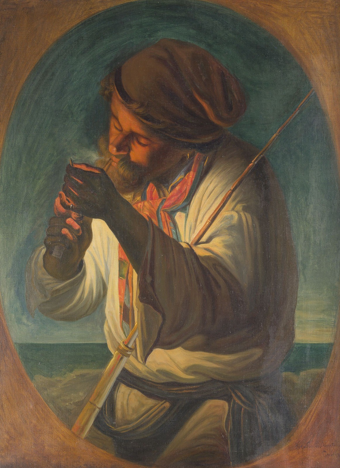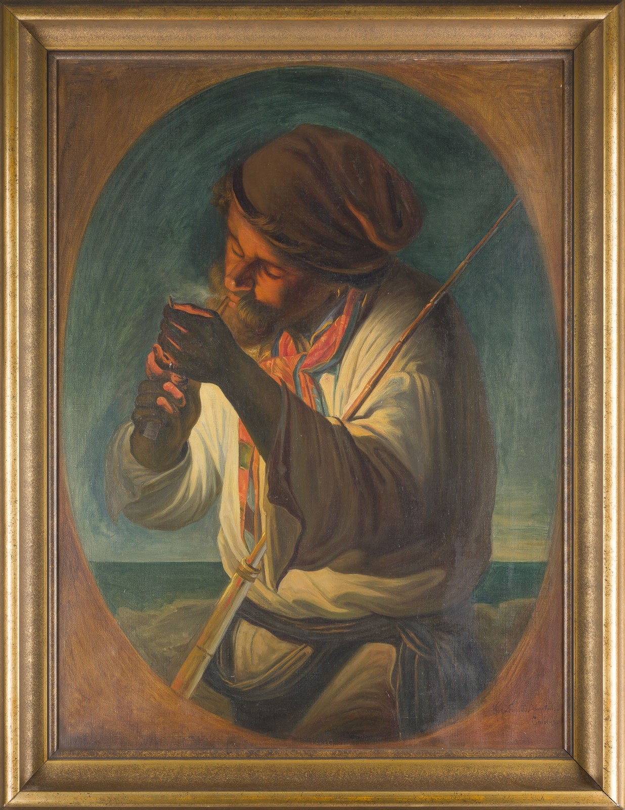 DIMITAR DOBROVICH (AFTER) 1816 Sliven - 1905 ibid. 'ANGLER' (COPY) Oil on canvas. 90 x 67 cm (F. 104 x 80,5 cm). Inscr. in Cyrillic lower right 'Cop.- Geor. H. Dimitrov. Sliven'. Dimitar Dobrovich is one of the important figures of Bulgaria's national revival. He studied in Italy and worked primarily as a portrait and history painter, combining academic painting traditions with motifs from Bulgarian history and culture. Part. retouches.