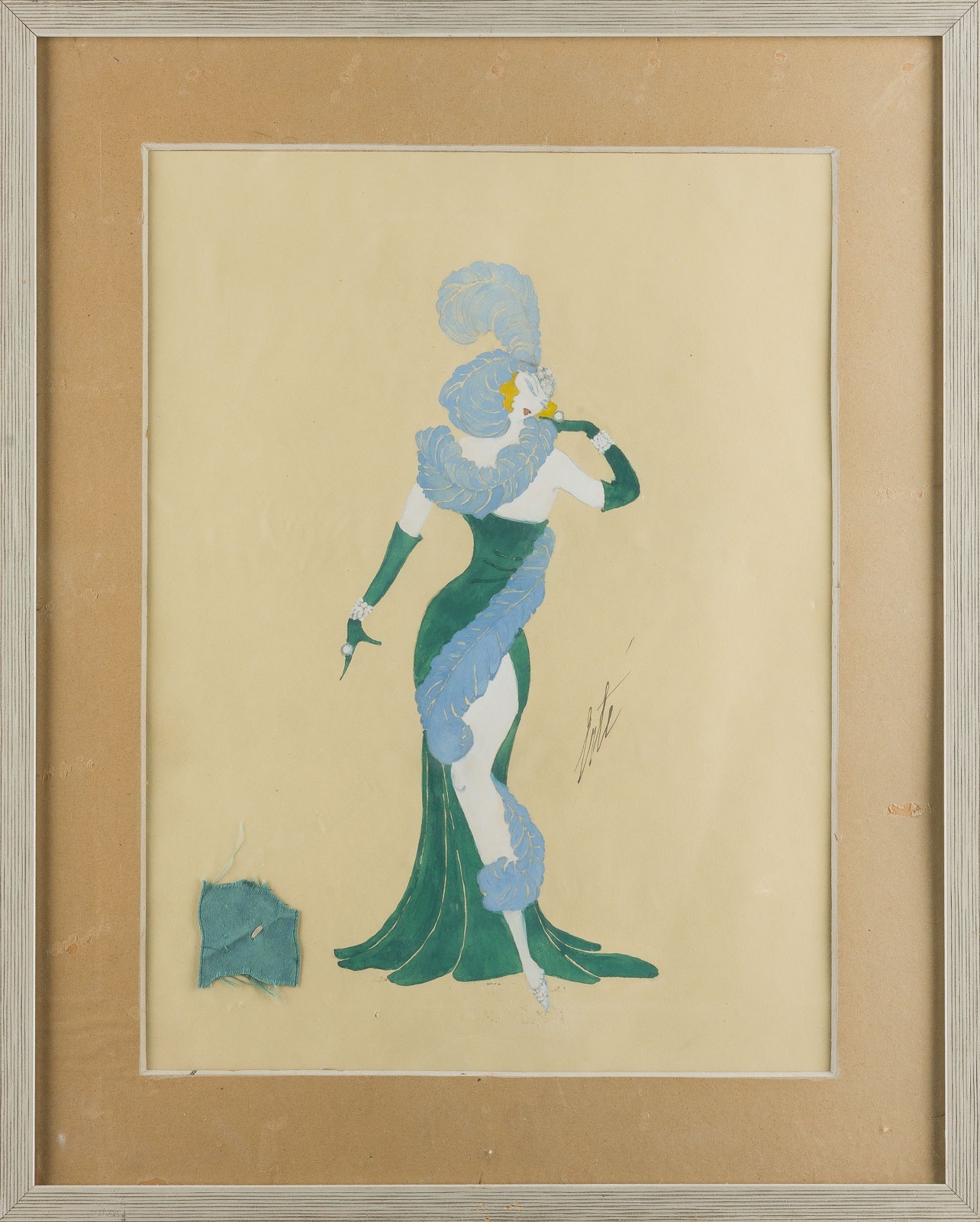 ROMAIN DE TIRTOFF (ATTR.) ('ERTÉ') 1892 St. Petersburg - 1990 Paris LADY IN A GREEN DRESS Mixed media on paper. Visible size 34 x 26 cm (F. 46 x 37 cm). Framed behind glass in a passepartout (unopened). Inscr. 'Erté' on the right. Verso: stamp 'Original composition. Erté. Romain de Tirtoff'. With a sewn-on fabric sample. Min. stained.