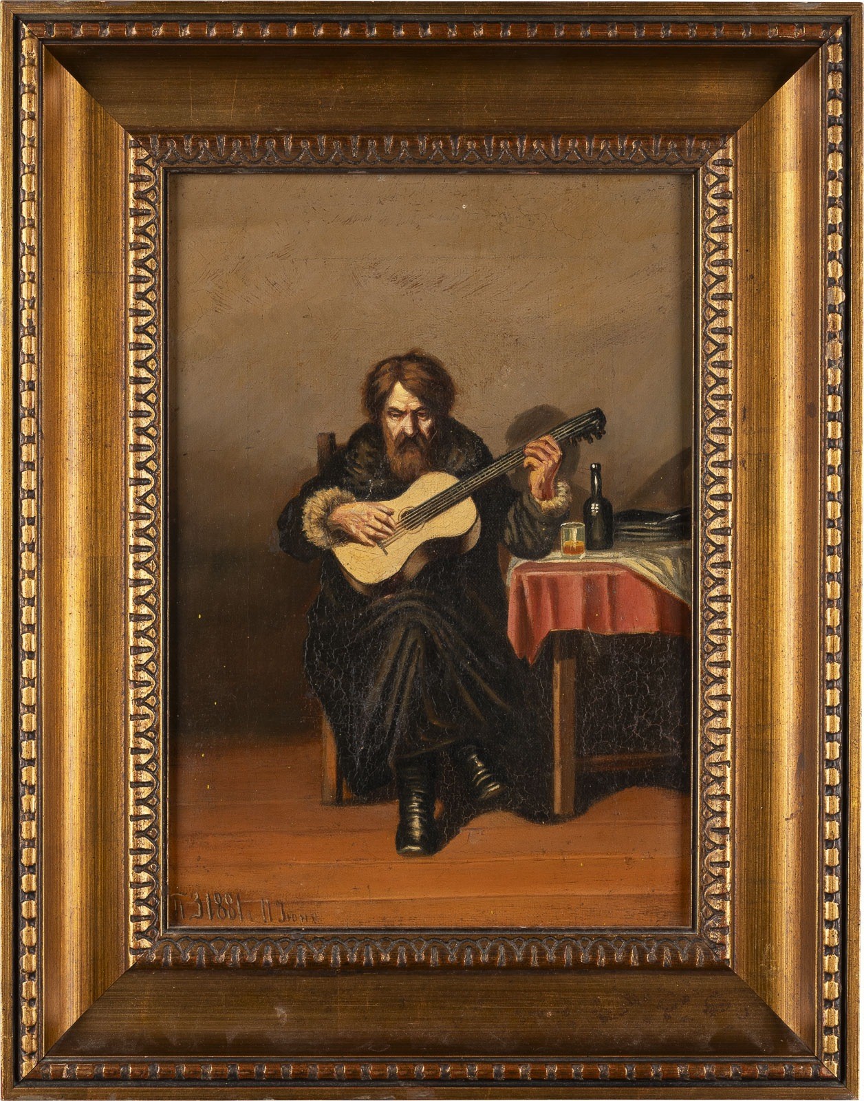 VASILY GRIGOREVICH PEROV (AFTER) 1834 Tobolsk - 1882 Moscow 'LONE GUITARIST' (COPY) Dated 1881 Oil on canvas. 37,5 x 26,8 cm (F. 51 x 40,3 cm). Inscr. and dated in Cyrillic lower left 'P3 1881 11th June'. Part. retouches, craquelure.