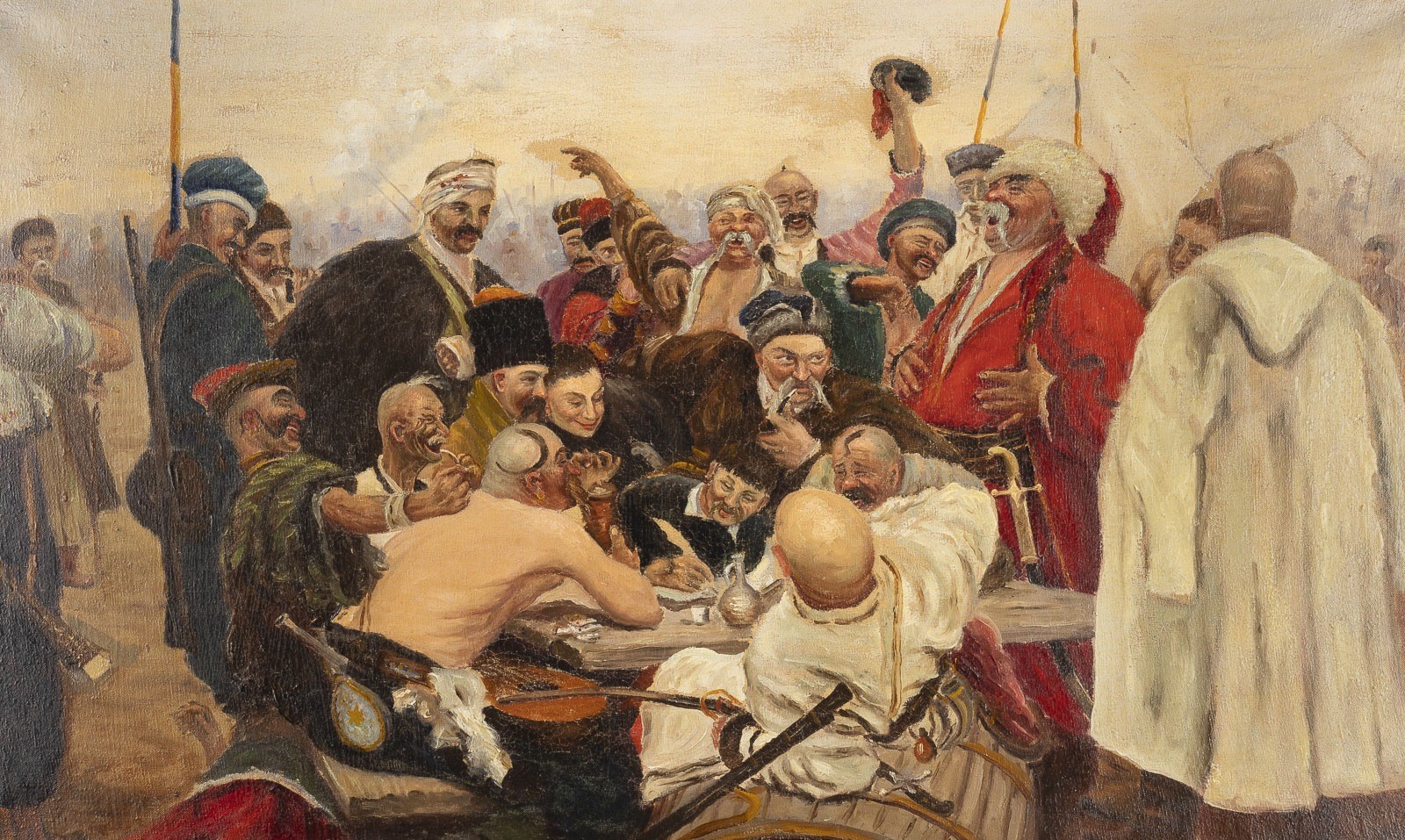 ILYA YEFIMOVICH REPIN (AFTER) 1844 Chuguev - 1930 Repino (Kuokkala) 'COSSACKS ARE WRITING A LETTER TO THE TURKISH SULTAN' (COPY) Oil on canvas. 54 x 88 cm (F. 64 x 98 cm). Min. craquelure.