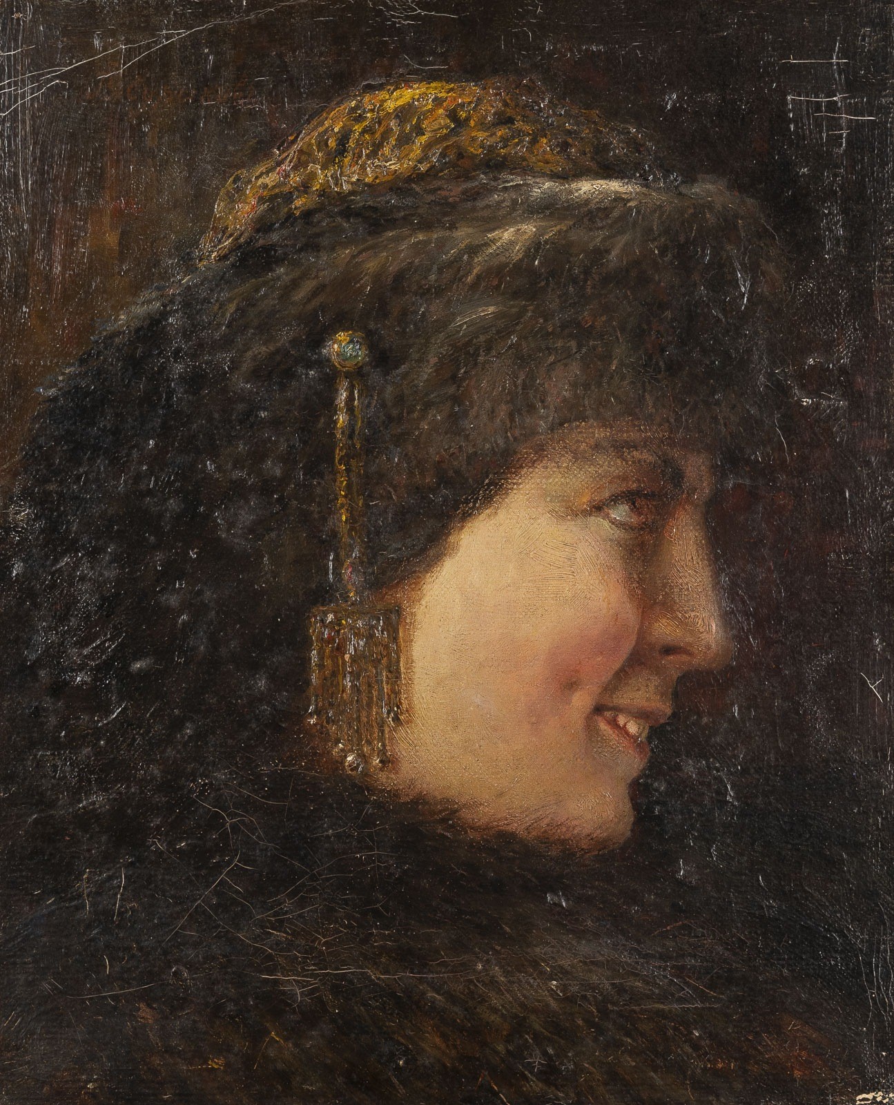 VASILY IVANOVICH SURIKOV (FOLLOWER) 1848 Krasnoyarsk - 1916 Moscow A PORTRAIT OF A BOYAR'S DAUGHTER IN A FUR HAT Oil on canvas. 42,4 x 35,2 cm (F. 44,8 x 37,7 cm). Inscr. in Cyrillic top left 'V. Surikov'. Soiled, margins part. rubbed.