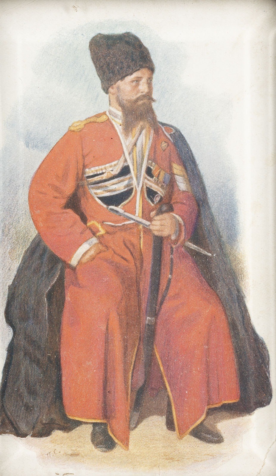 A POSTCARD SHOWING SERGEANT OF HIS IMPERIAL MAJESTY´S OWN CONVOY Russian, St. Petersburg, R. Golike, A. Vilborg, 1900s Lithograph on cardboard. 14 x 9,4 cm (F. 19,2 x 14,8 cm). Framed behind glass. Verso inscr. From the series 'Military Uniforms'. Torn lower right, min. stained.