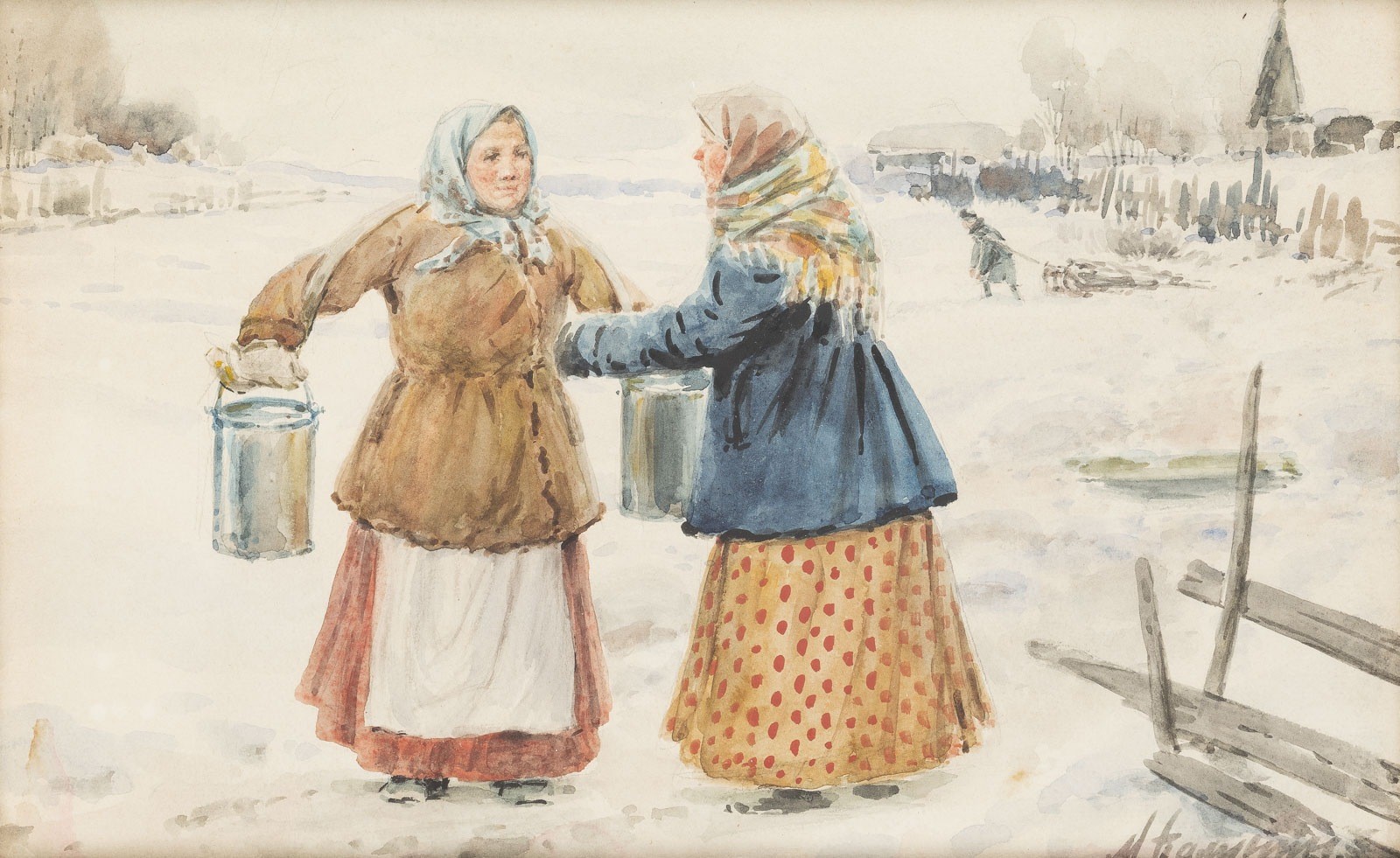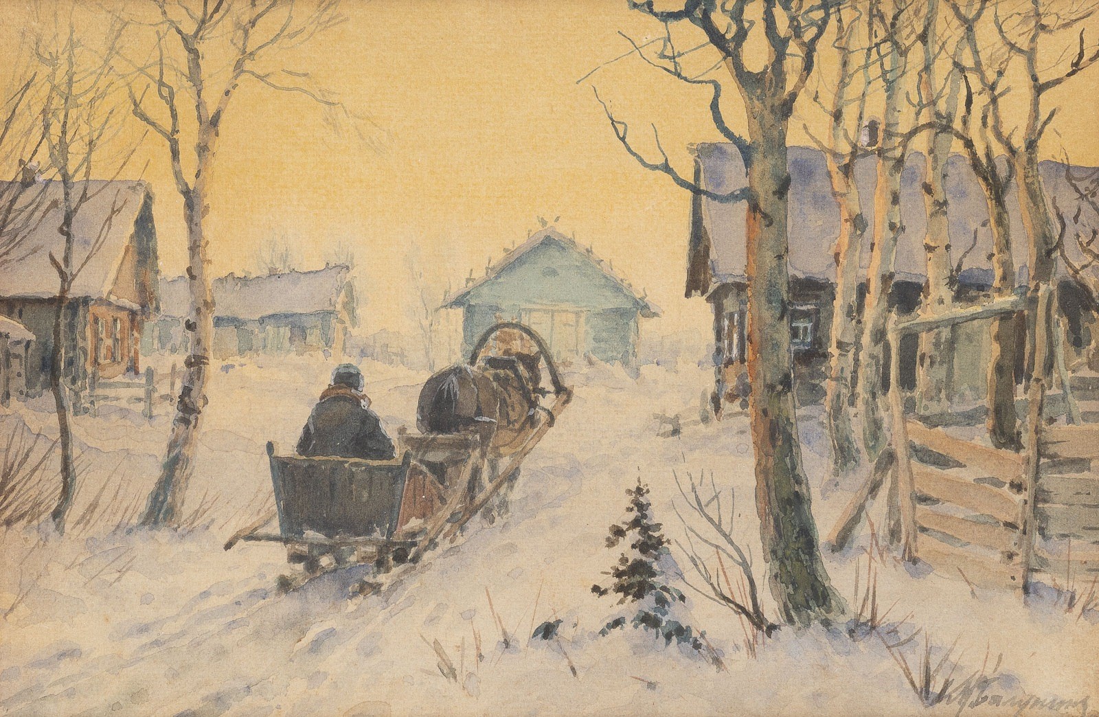 A COLLECTION OF THREE WORKS Gouache or watercolour on cardboard/paper. Various sizes. Each framed behind glass (verso sealed, unopened). Each signed in Cyrillic lower right. NIKOLAY KALABANOVSKY, On the tram, visible size 30 x 24 cm (F. 35 x 29 cm). MIKHAIL BALUNIN (1875-1938), Sleigh ride, visible size 18 x 26 cm (F. 24,5 x 32,5 cm); Women near the ice hole, visible size 20 x 30,5 cm (F. 26 x 36,5 cm). Part. stained, part. min. browned.