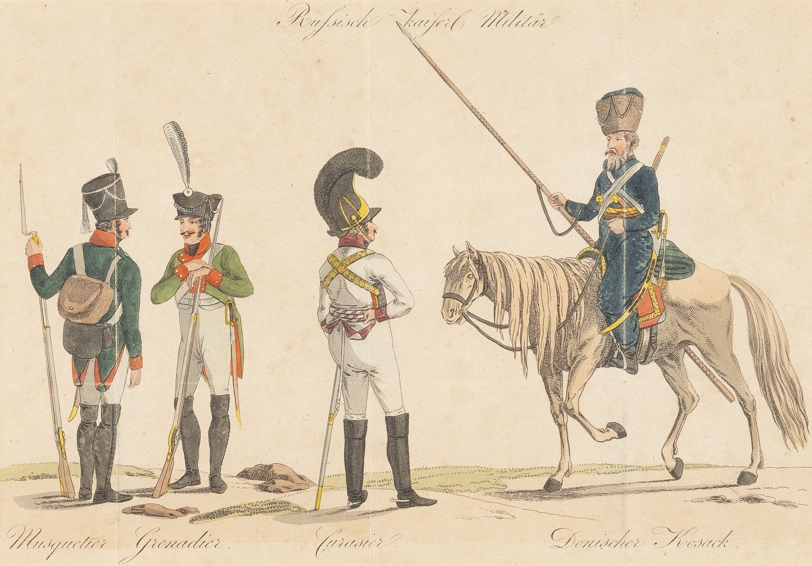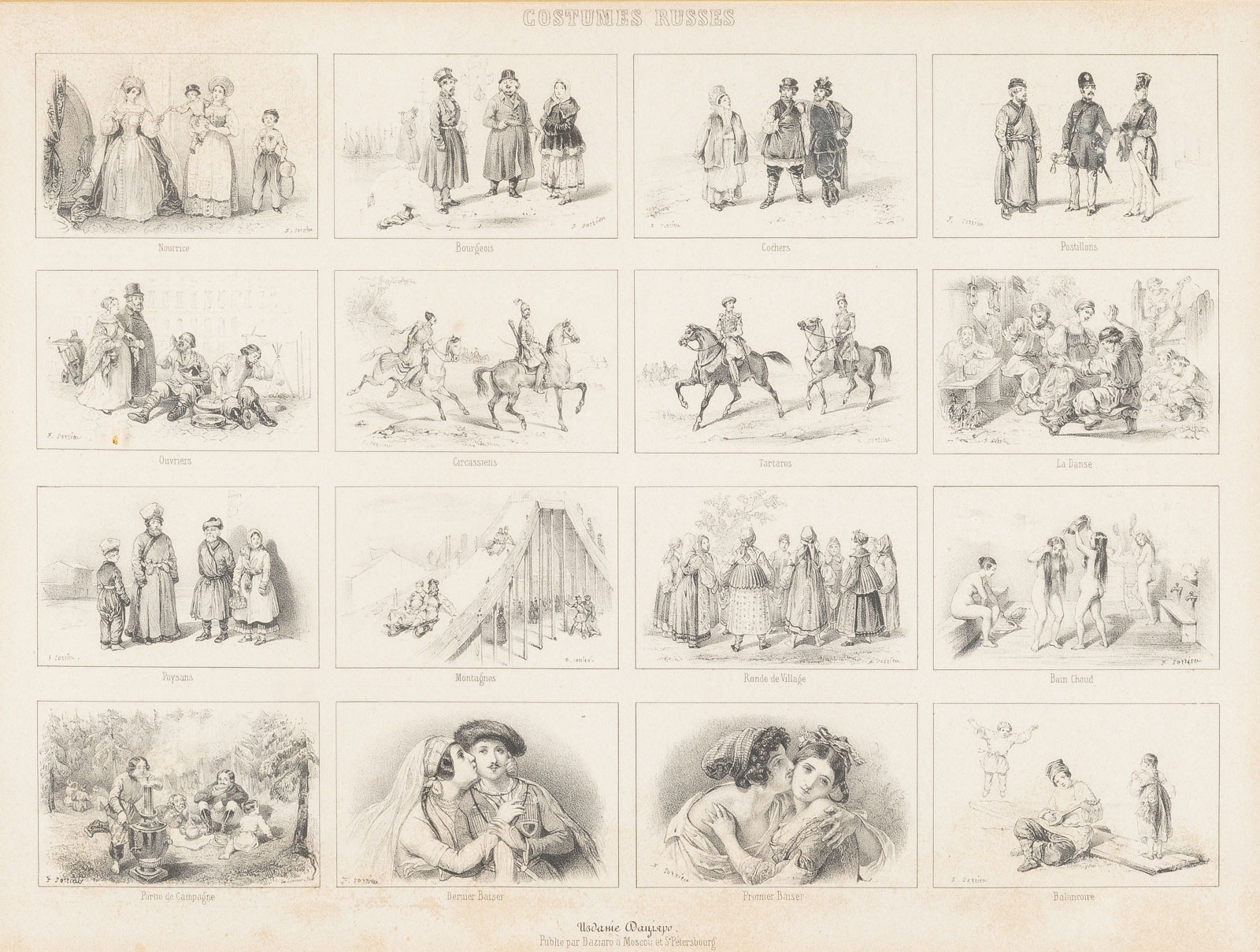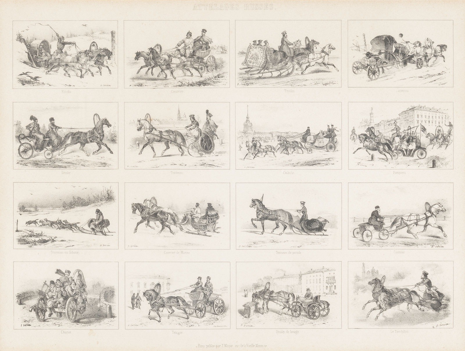A COLLECTION OF THREE WORKS DEPICTING SCENES OF RUSSIAN LIFE Austria-Hungary, Prague/France, Paris/Russia, 19th century Engraving or lithograph on paper. Visible size 20 x 28,8 cm/23,5 x 31 cm (F. 29,2 x 38,5 cm/39,8 x 47 cm). Each framed behind glass in passepartout (verso sealed, unopened). Inscr. in German or French: 'Russian Imperial Military'/'Russian Carriage Driving'/'Russian Costume'. Part. browned.