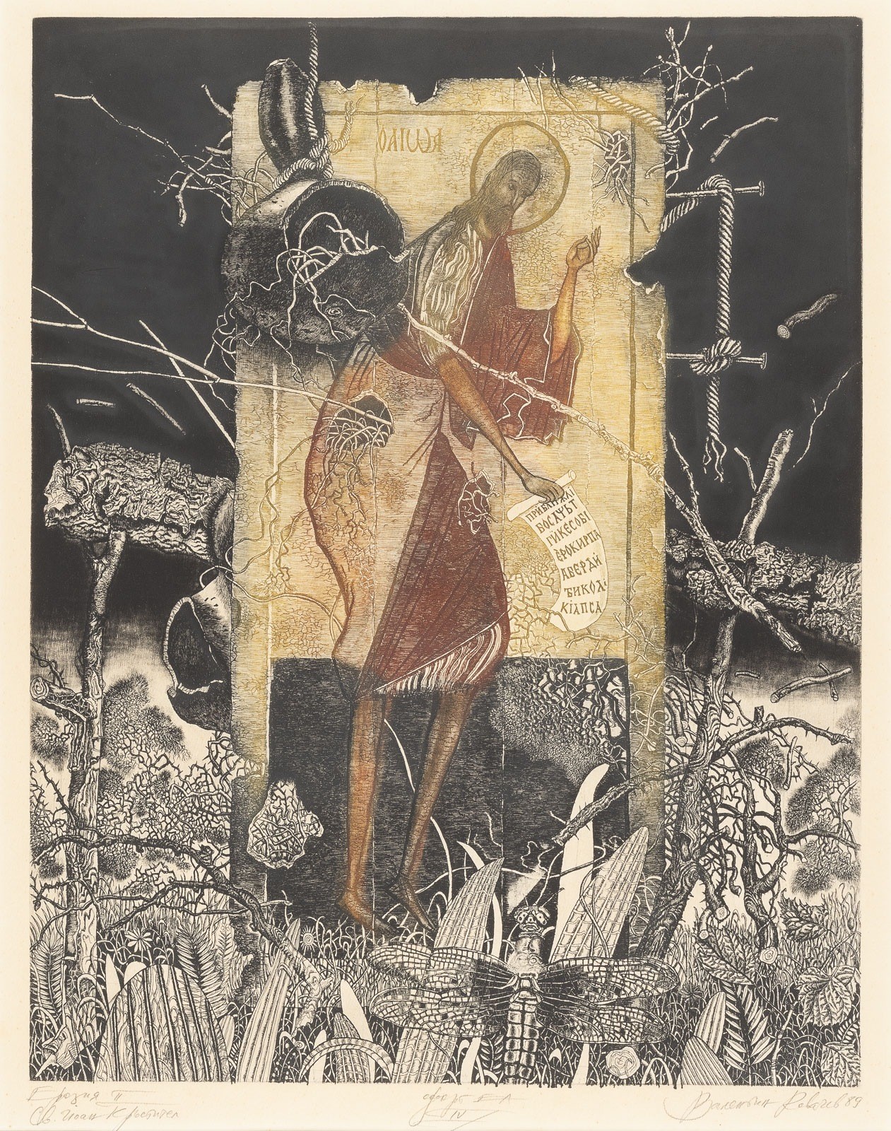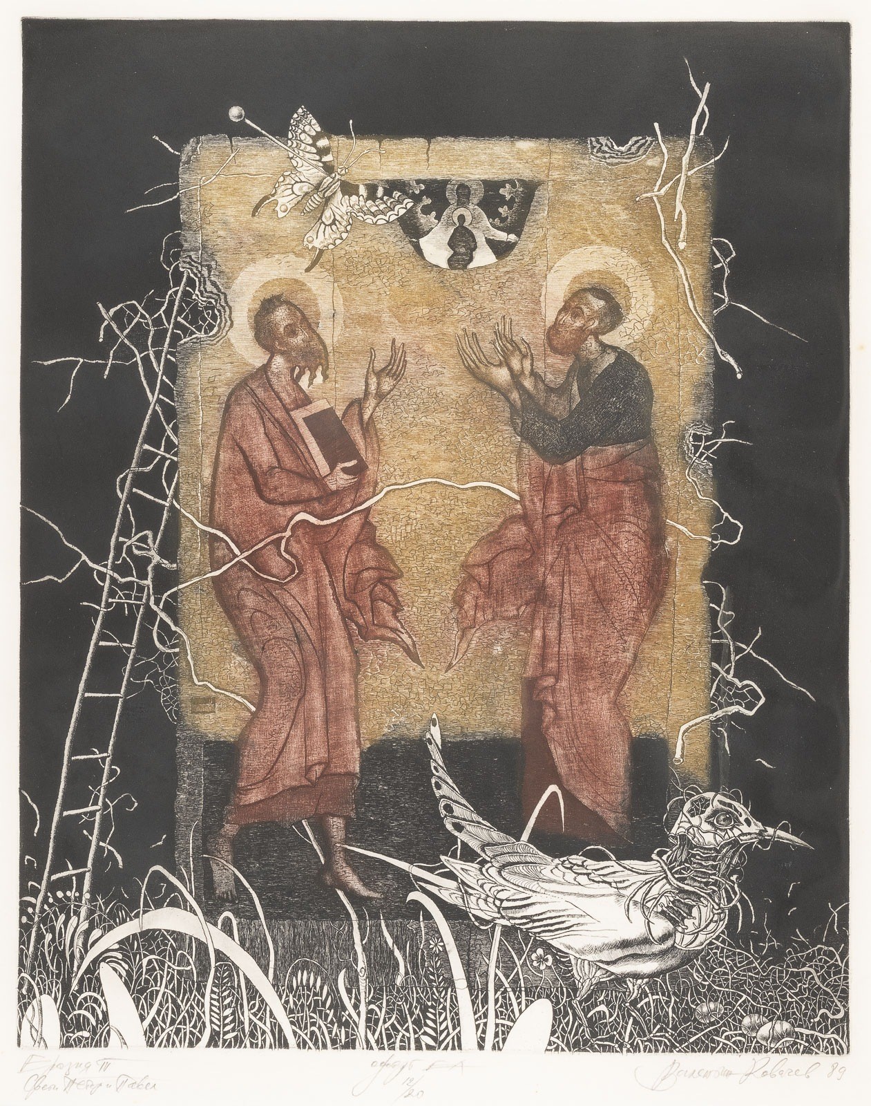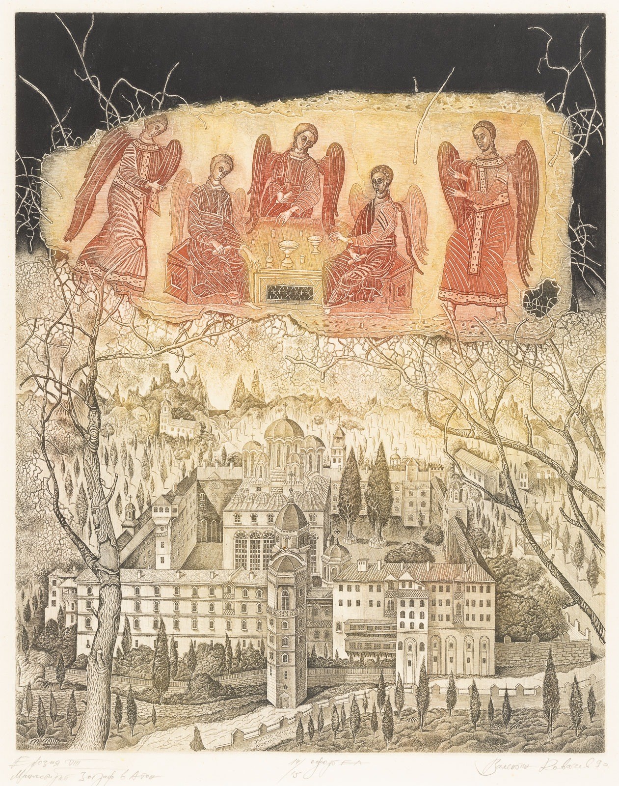 VALENTIN KOVACHEV 1953 Sofia A COLLECTION OF FOUR ETCHINGS DEPICTING SELECTED SAINTS AND OLD TESTAMENT TRINITY Dated (19)89/(19)90 Etching on paper. Each visible size 43 x 34,5 cm (each F. 62 x 50,5 cm). Each framed behind glass in passepartout (verso sealed, unopened). Each titled, numbered, signed in Cyrillic and dated on the lower margin.
