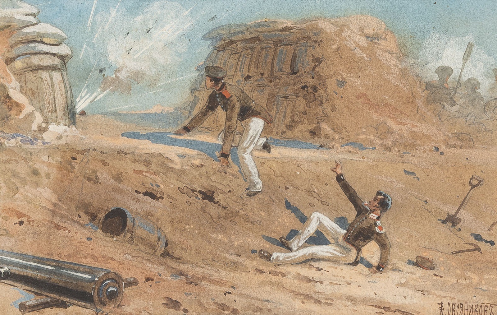 VALERIY PAVLOVICH OVSYANIKOV 1862-1911 BATTLEFIELD SCENE Mixed media on paper. Visible size 9 x 14 cm (F. 25 x 30 cm). Framed behind glass in passepartout (verso sealed, unopened). Signed in Cyrillic lower right 'V. Ovsyanikov'.