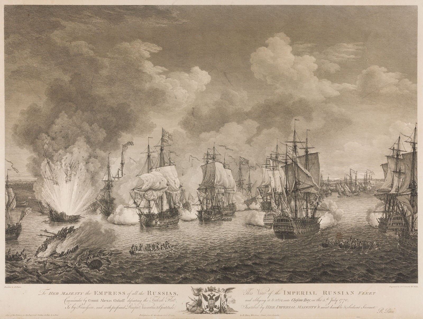 BATTLE OF CHESME BAY England, Richard Paton, P.C. Canot & W. Watts, 1777 Engraving on paper laid down on cardboard. 52 x 73,5 cm. Lower inscribed. Min. browned.