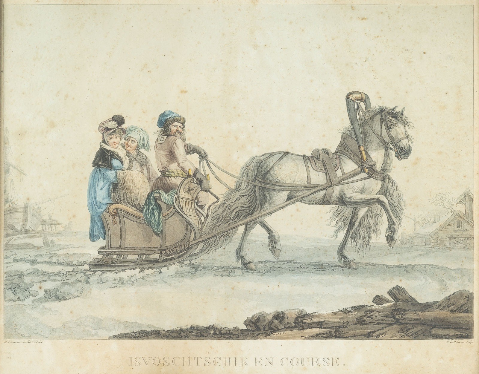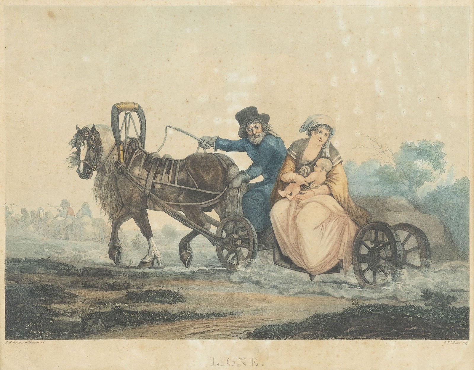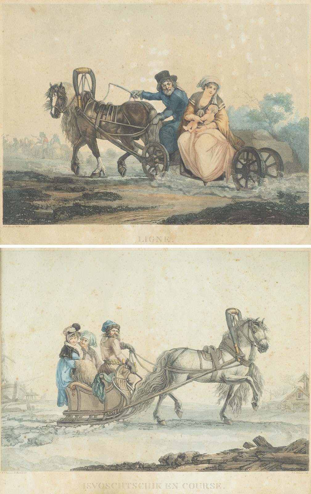 TWO WORKS: 'CARRIAGE LINE'. 'COACHMAN ON THE ROUTE' French, Bassand Prints, M.F. Damane-Demartrais, P.L. Debucourt, early 19th century Coloured aquatint on paper. Each 37,5 x 45,5 cm (F. 46 x 54 cm). Each framed behind glass. Inscr. in french lower and titled 'Ligne' or 'Isvoschtschik en course.' Browned, part. stained.