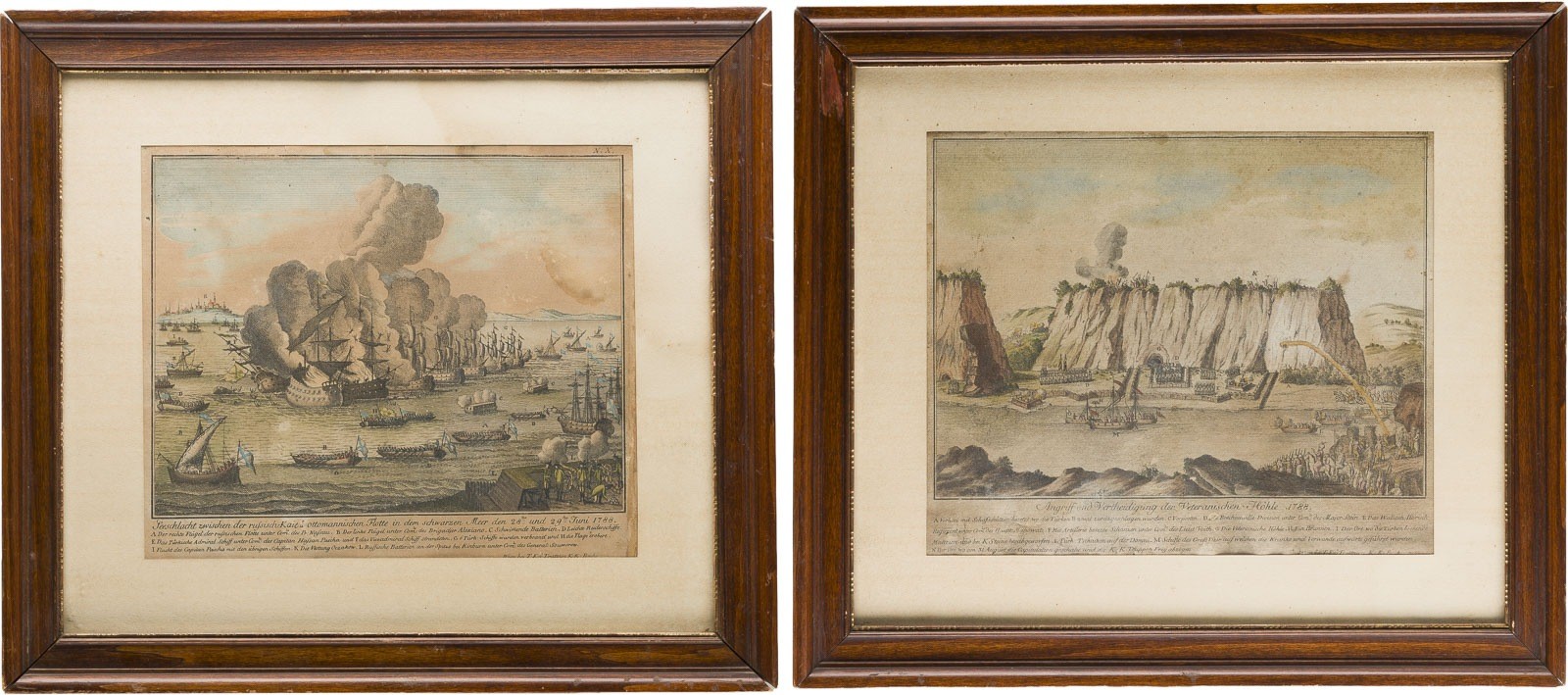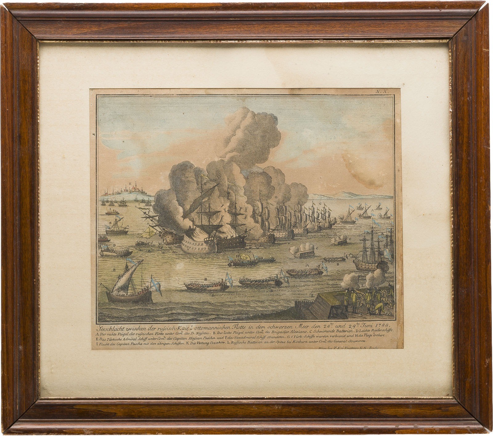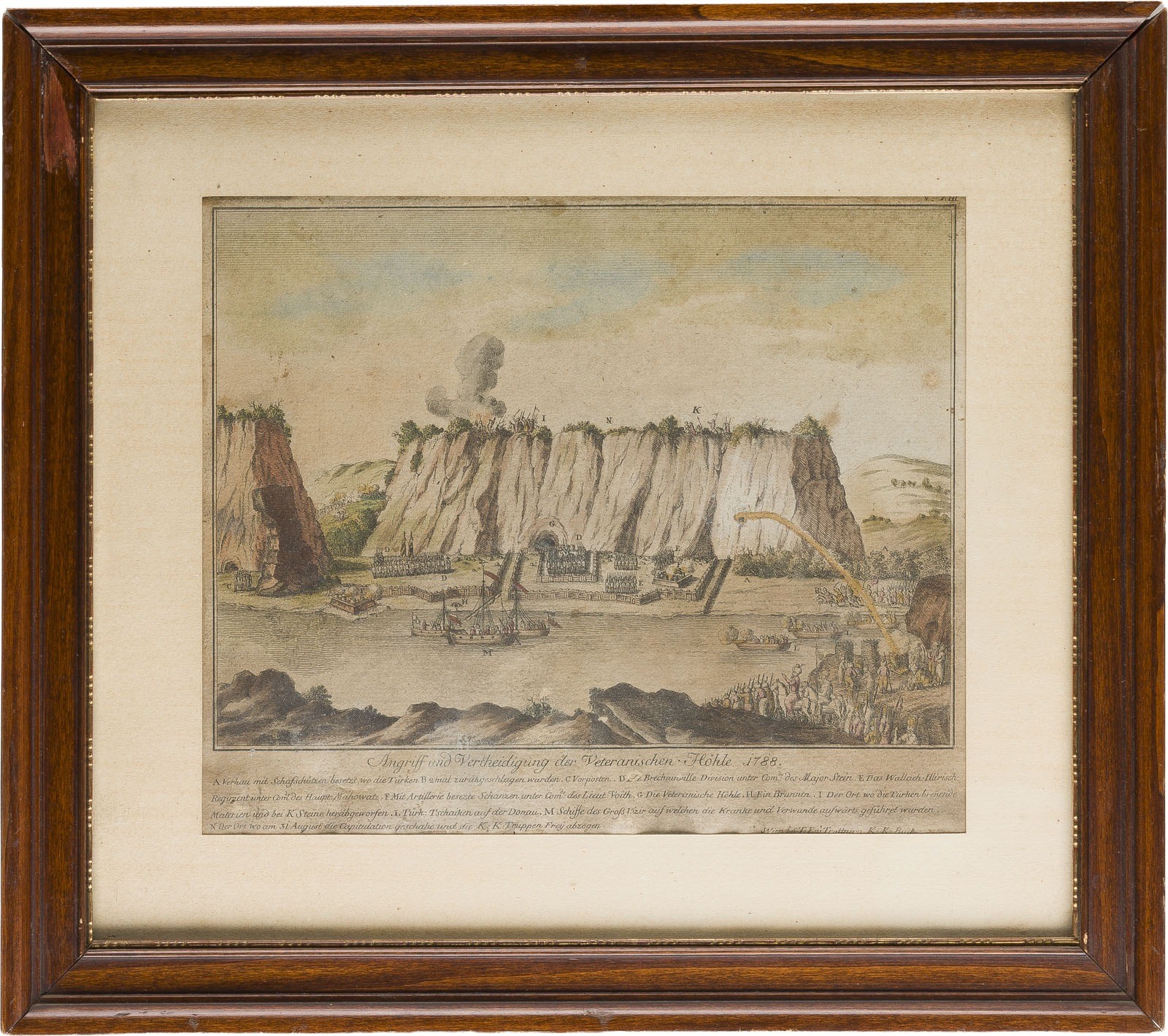 TWO WORKS DEPICTING BATTLE SCENES Austria, Vienna, J.T. Edler von Trattner, 1788 Colored engraving on paper. Visible size 19,4 x 23,2 cm / 20 x 23,8 cm (each F. 32,5 x 36,5 cm). Each framed behind glass in a passepartout (verso sealed, unopened). Titled in German below: 'Naval Battle between the Russian and Ottoman Fleets in the Black Sea, June 28th and 29th, 1788' and 'Attack and Defense of the Veterans' Cave, 1788'. Browned, min. torn.