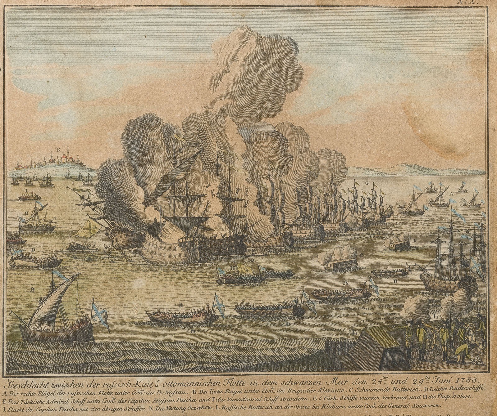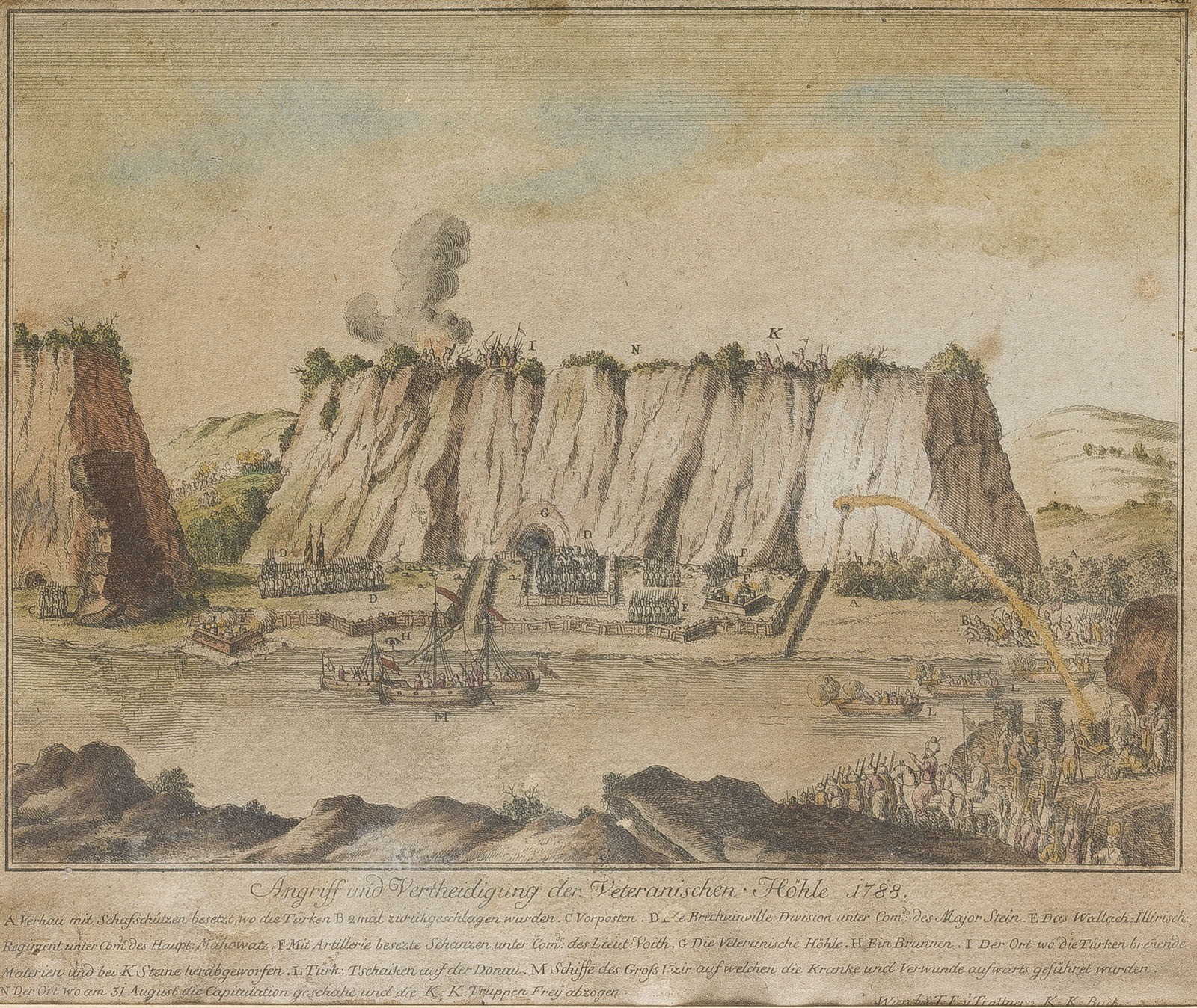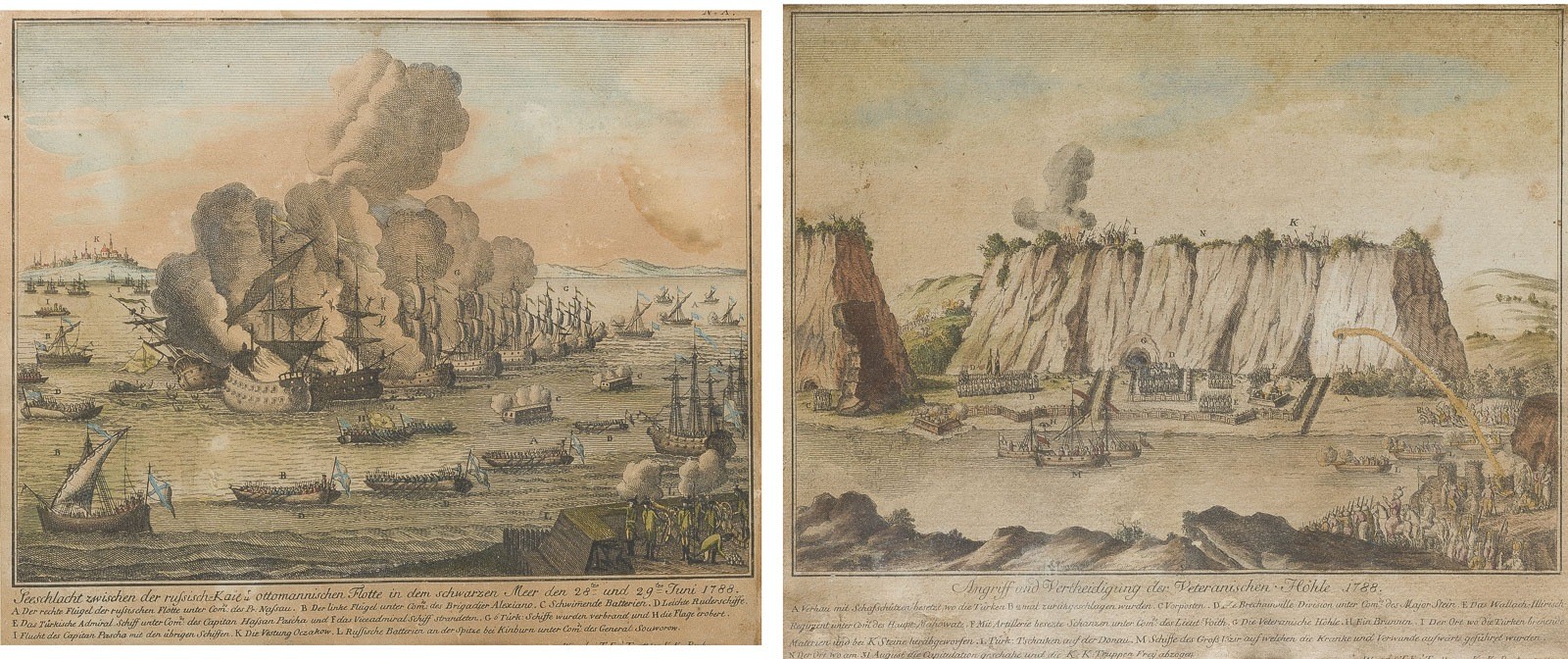 TWO WORKS DEPICTING BATTLE SCENES Austria, Vienna, J.T. Edler von Trattner, 1788 Colored engraving on paper. Visible size 19,4 x 23,2 cm / 20 x 23,8 cm (each F. 32,5 x 36,5 cm). Each framed behind glass in a passepartout (verso sealed, unopened). Titled in German below: 'Naval Battle between the Russian and Ottoman Fleets in the Black Sea, June 28th and 29th, 1788' and 'Attack and Defense of the Veterans' Cave, 1788'. Browned, min. torn.