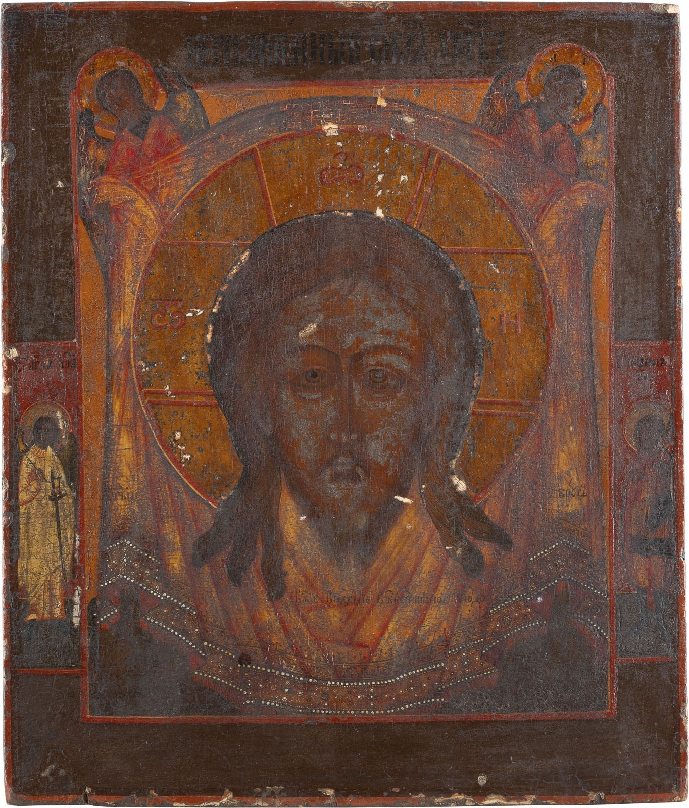 A LARGE ICON SHOWING THE MANDYLION Russian, circa 1800 Tempera on wood panel. The halo made of silver, covered by a golden lacquer. Two selected saints on the borders, the Guardian Angel among them. Minor losses. 40.2 x 34.5 cm.