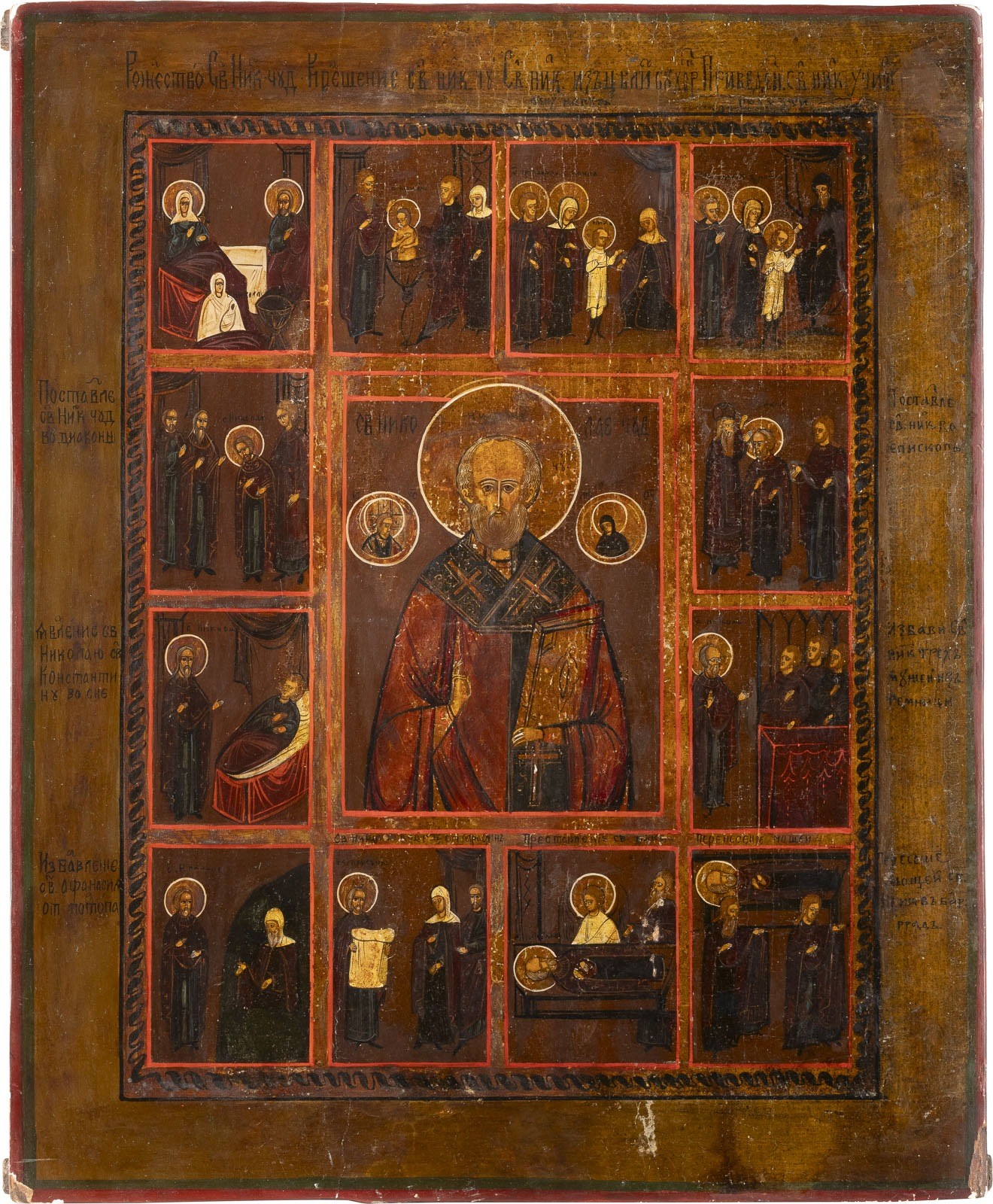 A LARGE VITA ICON OF ST. NICHOLAS OF MYRA Russian, 19th century Tempera on wood panel with kovcheg. The haloes made of silver, covered by a golden lacquer. Partially restored. 45 x 36.5 cm.