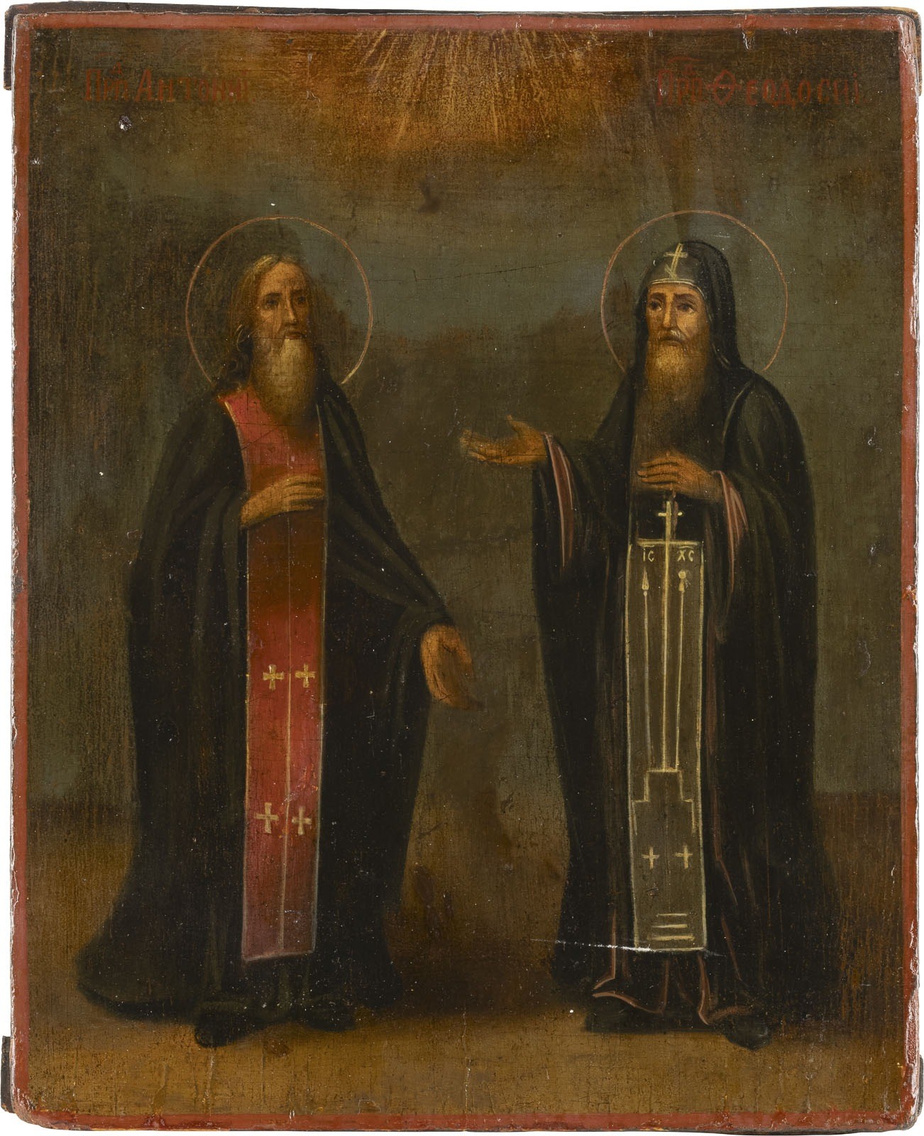 AN ICON SHOWING ST. ANTHONY AND THEODOSIUS OF KIEV Russian, 19th century Oil on wood panel. Minimally restored. 30 x 24.6 cm.
