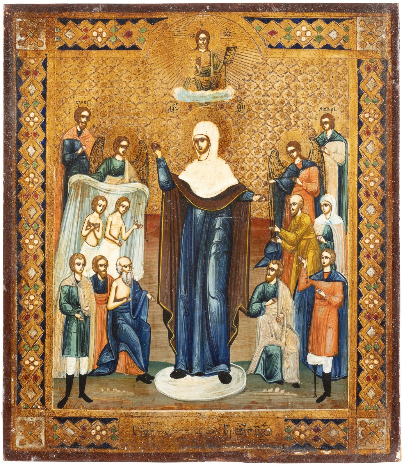 AN ICON SHOWING THE MOTHER OF GOD 'JOY TO ALL WHO GRIEVE' Russian, late 19th century Tempera on wood panel. The background made of silver, covered by a golden lacquer. The borders ornately incised and painted in faux enameling. 30.6 x 27 cm.