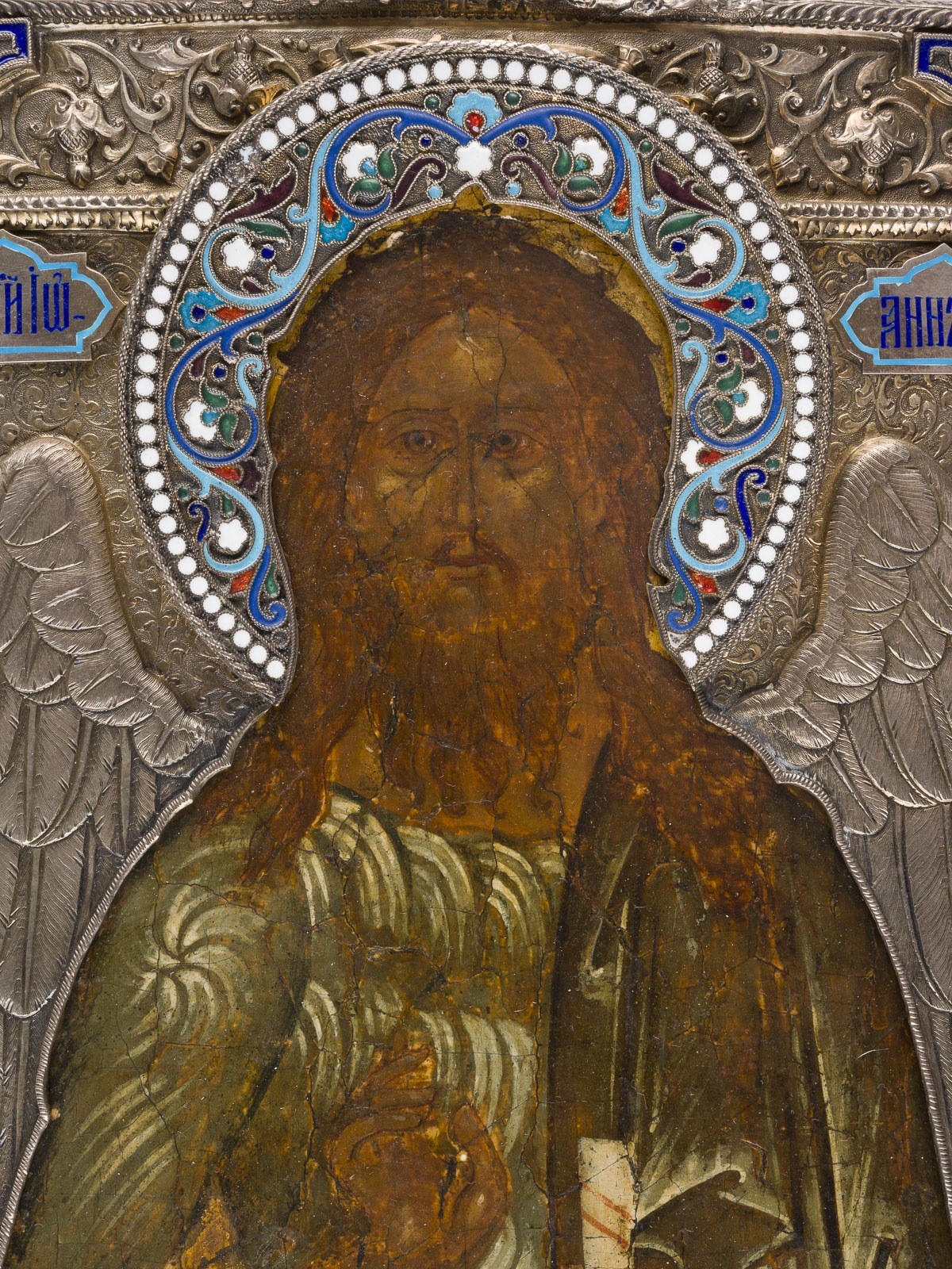 BEDEUTENDE IKONE MIT JOHANNES DEM VORLÄUFER ALS ENGEL DER WÜSTE MIT CLOISONNÉ-EMAIL-RIZA