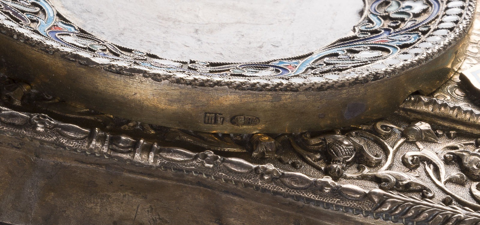 AN IMPORTANT ICON SHOWING ST. JOHN THE FORERUNNER AS ANGEL OF THE DESERT WITH SILVER-GILT AND CLOISONNÉ ENAMEL RIZA Russian, Novgorod, 15th century (icon), Russian, Moscow, Dmitry Shyelaputin, 1908-1917 (riza) Tempera on wood panel. The saint depicted half-length. The colour scheme captivates with an appealing blue-green chromaticity, while the structure of the garment is rendered in white. Overlaid with a finely chased and repoussé silver-gilt riza. The four corners and halo enamelled with polychrome scrolls. The raised foliate border finely chased and embossed. Marked with assayer's mark, 84 standard and master's mark 'D. SHELAPUTIN' in Cyrillic. Partially restored. 24.4 x 18 cm.