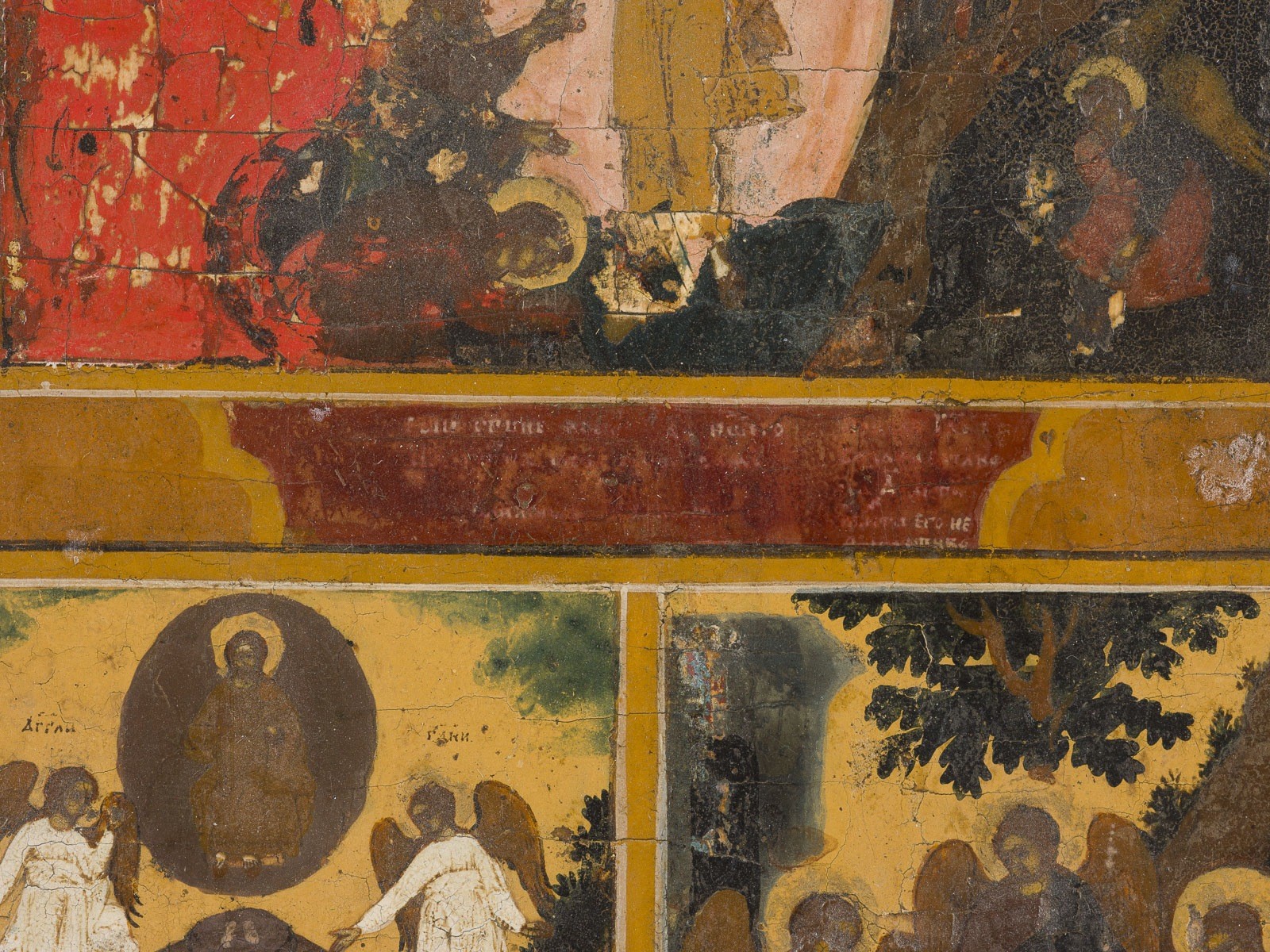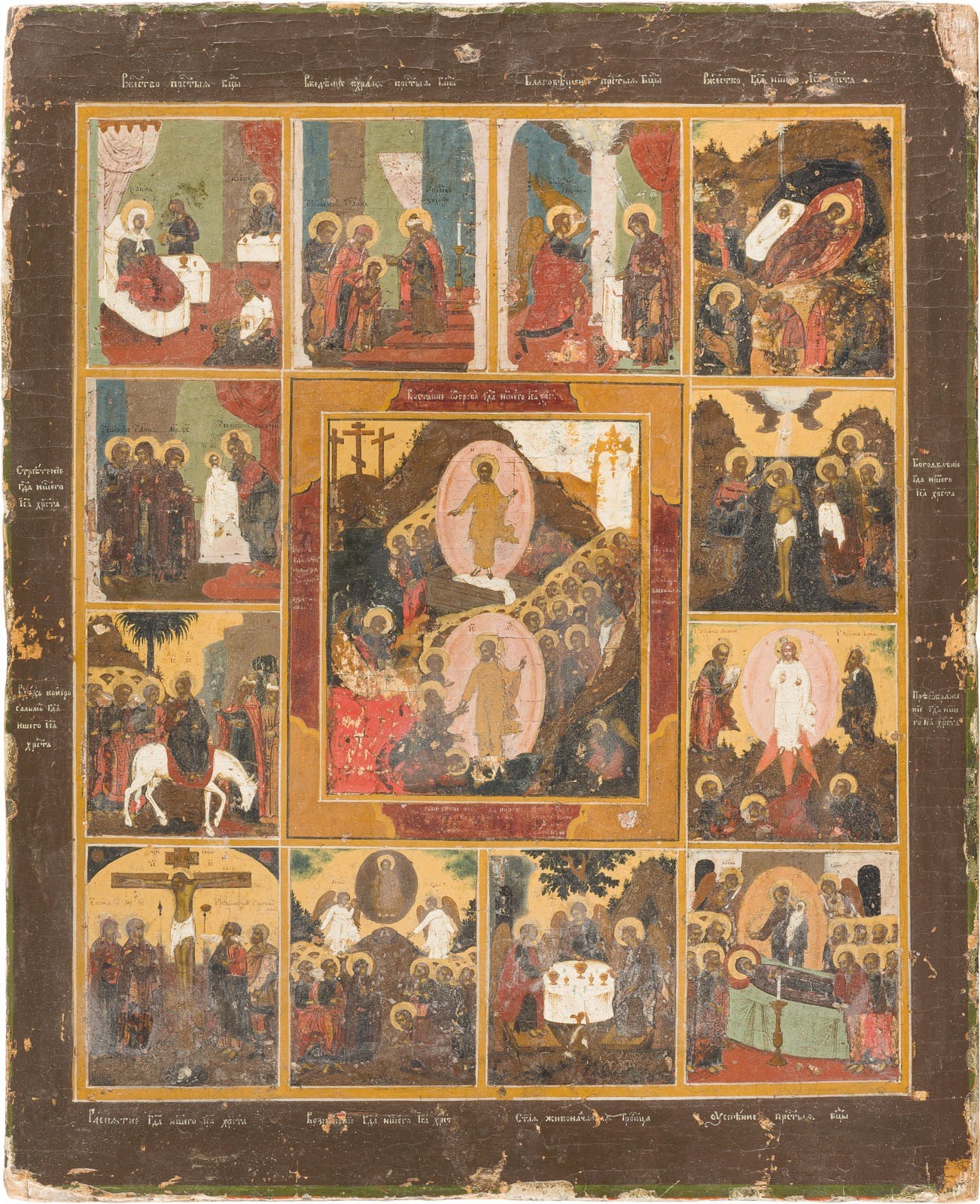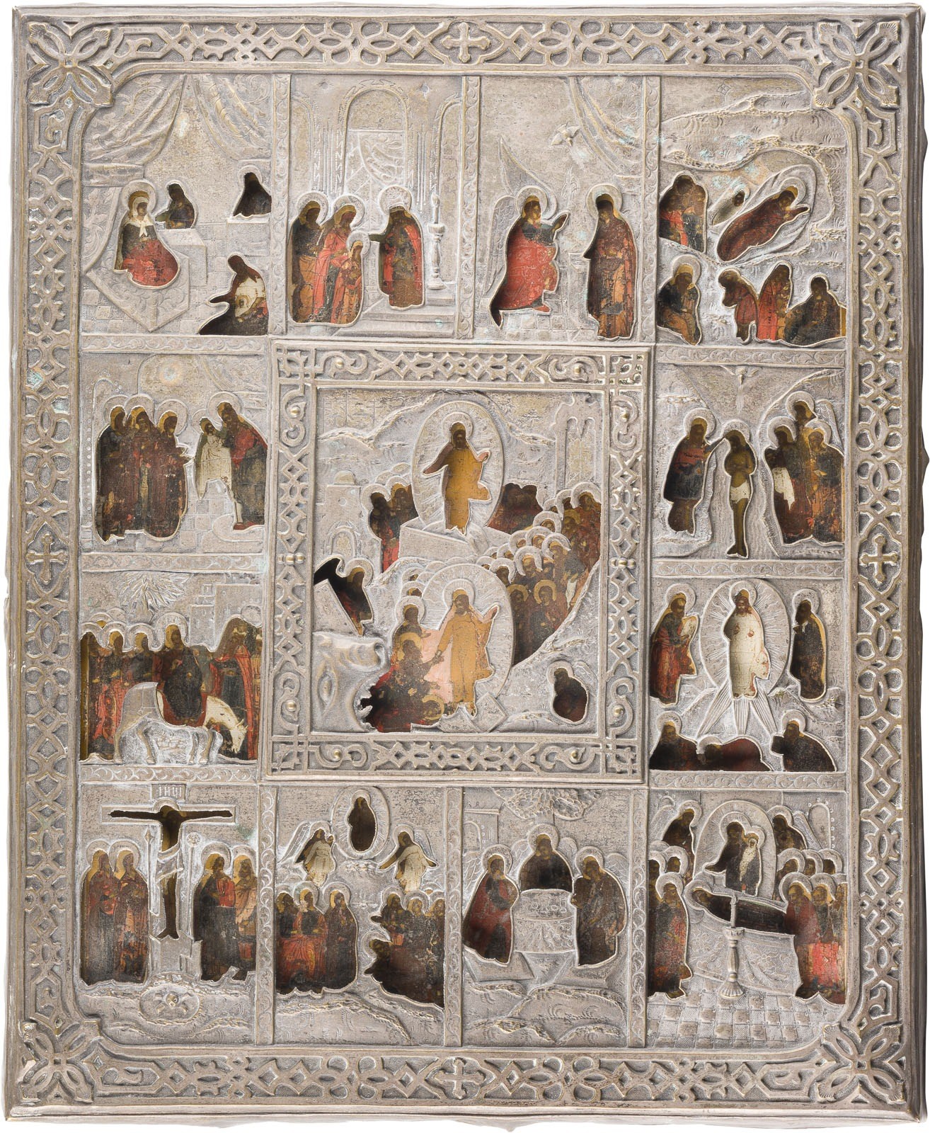 A DATED ICON SHOWING THE RESURRECTION OF CHRIST AND THE DESCENT INTO HELL WITH TWELVE MAJOR FEASTS AND RIZA Russian, dated 1884 Tempera on wood panel. The silvered brass riza embossed with strapwork. Dated within a cartouche below the central image. Losses to the borders. 36.5 x 29.7 cm.