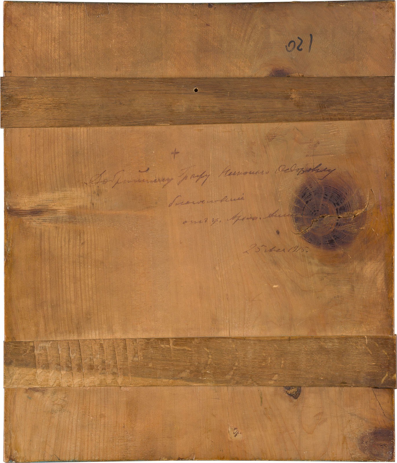 A DATED ICON WITH SAINT JOB, HEGUMEN OF POCHAEV Russian, dated 1915 Tempera on wood panel, gold ground, border ornamentally punched. The reverse with Cyrillic dedicatory inscription: 'To the kindest Count Nikolai Feodorovich, a blessing from fr. Count Archip A(?). 25 May 1915.' Minor paint losses. 31 x 26.8 cm.