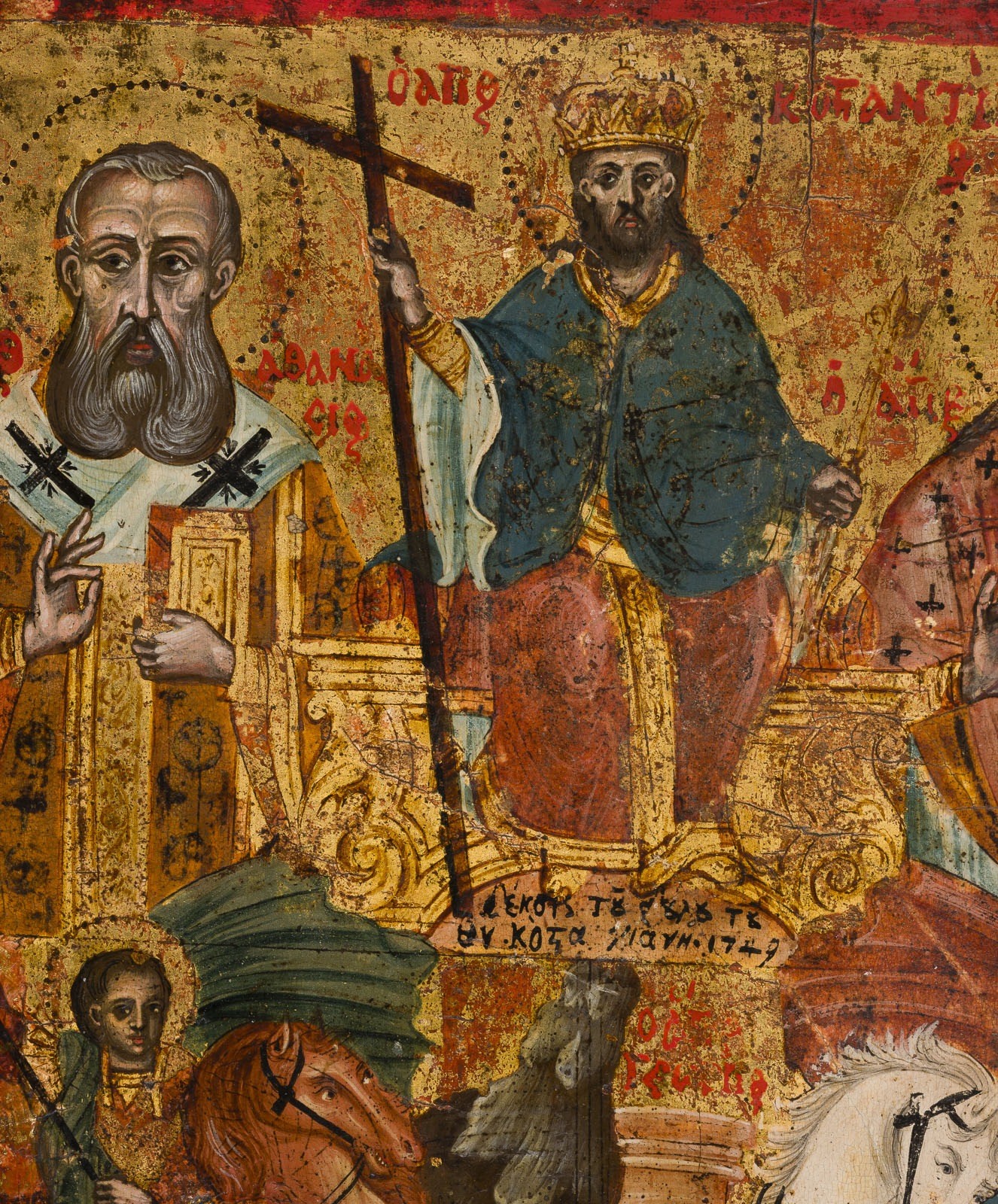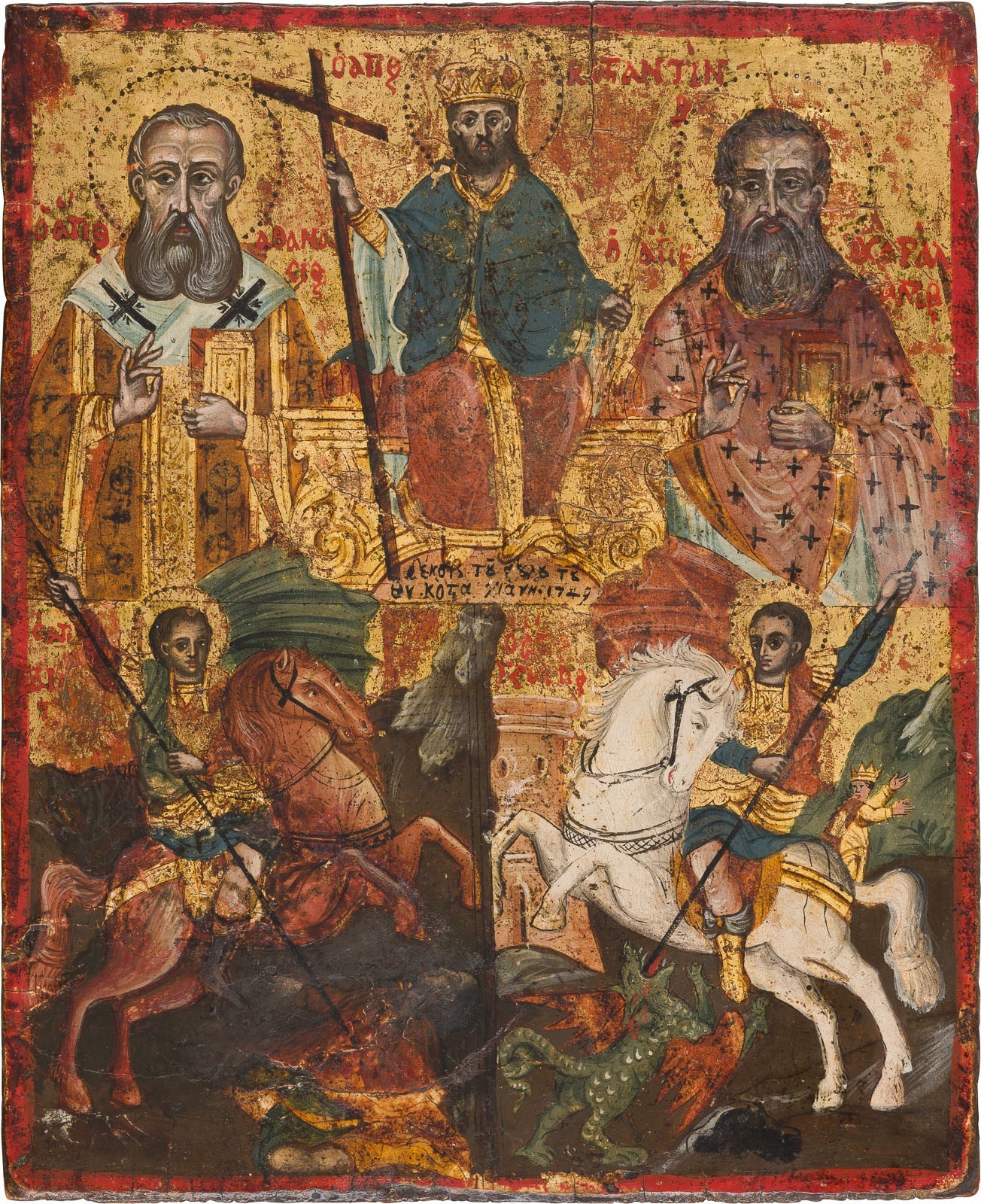 A DATED ICON SHOWING STS. CONSTANTINE, ATHANASIUS, HARALAMBOS, DEMETRIUS AND GEORGE SLAYING THE DRAGON Greek, dated 1749 Tempera on wood panel. Finely executed on gold ground. Inscribed in Greek and dated '1749'. Partially restored. 24.7 x 20.2 cm.