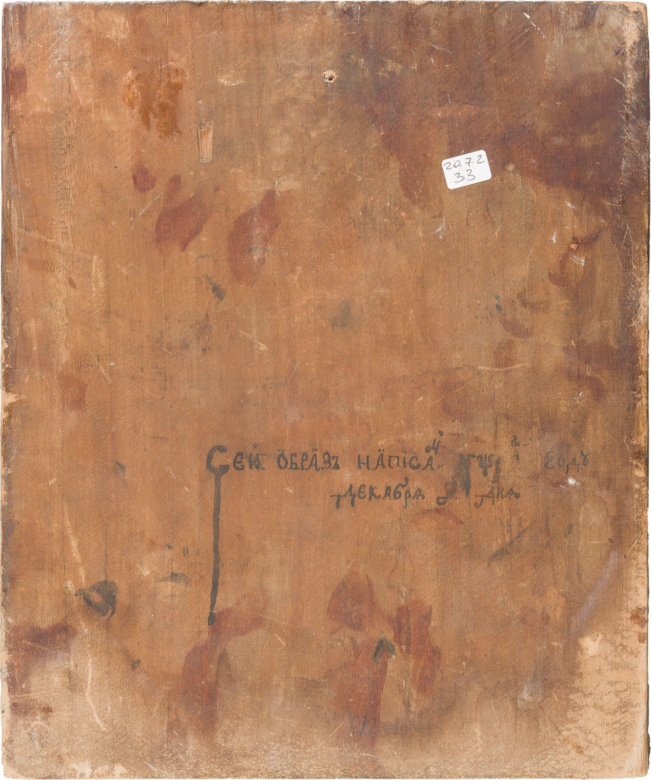A DATED ICON SHOWING THE MOTHER OF GOD 'JOY TO ALL WHO GRIEVE' Russian, 18th century Tempera on wood panel. The haloes made of gold. On the reverse Cyrillic date '17[??]'. Background stripped to gesso, partially restored. 30.6 x 26 cm.