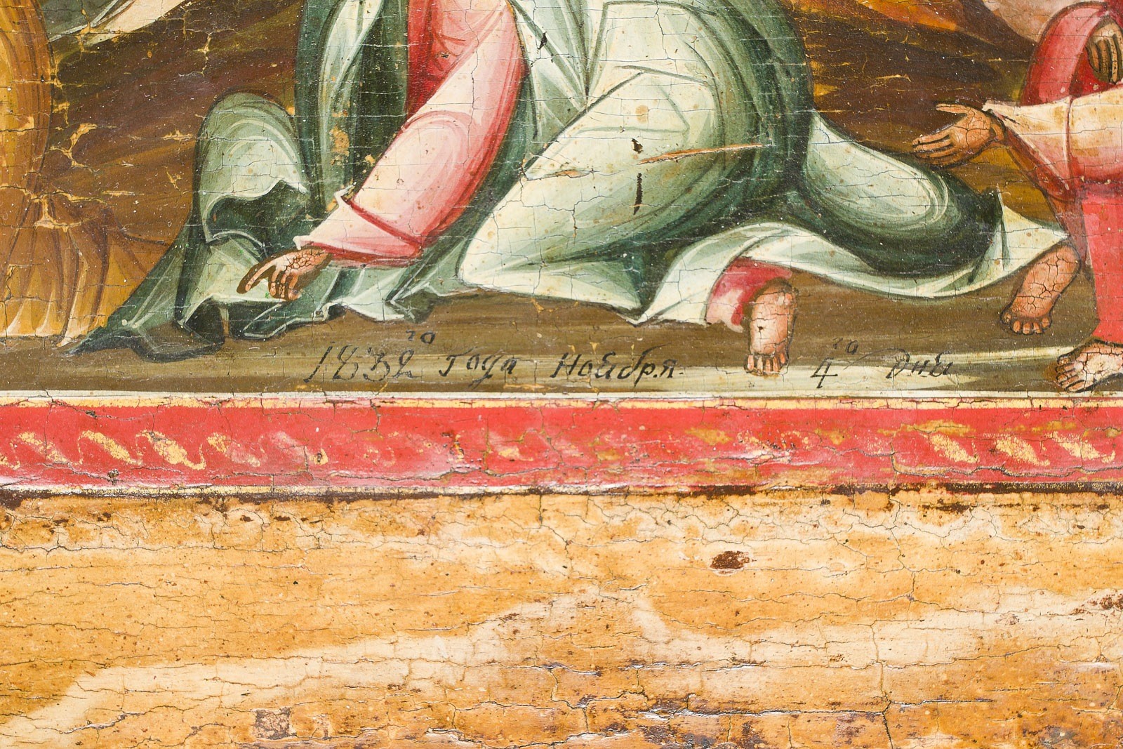 A DATED ICON OF THE TRANSFIGURATION OF CHRIST ON MOUNT TABOR Russina, dated 1832 Tempera on wood panel with kovcheg. Christ in standing against a gilded mandorla. Russian date '4 November 1832' at the lower edge. Some edge damage, partially restored. 32.1 x 28.7 cm.