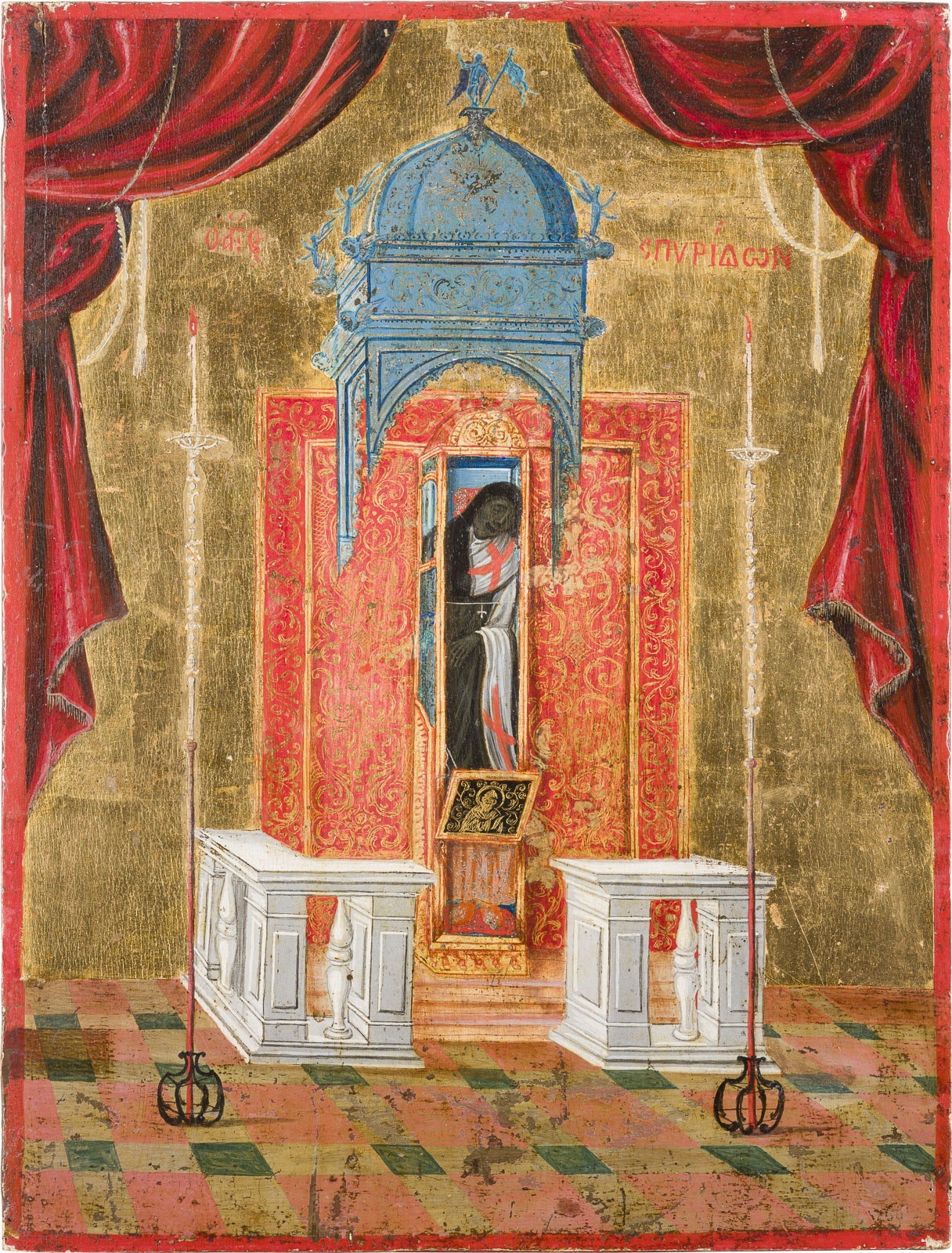 DATIERTE UND GROSSE IKONE MIT DEM RELIQUIENSCHREIN DES HEILIGEN SPYRIDON