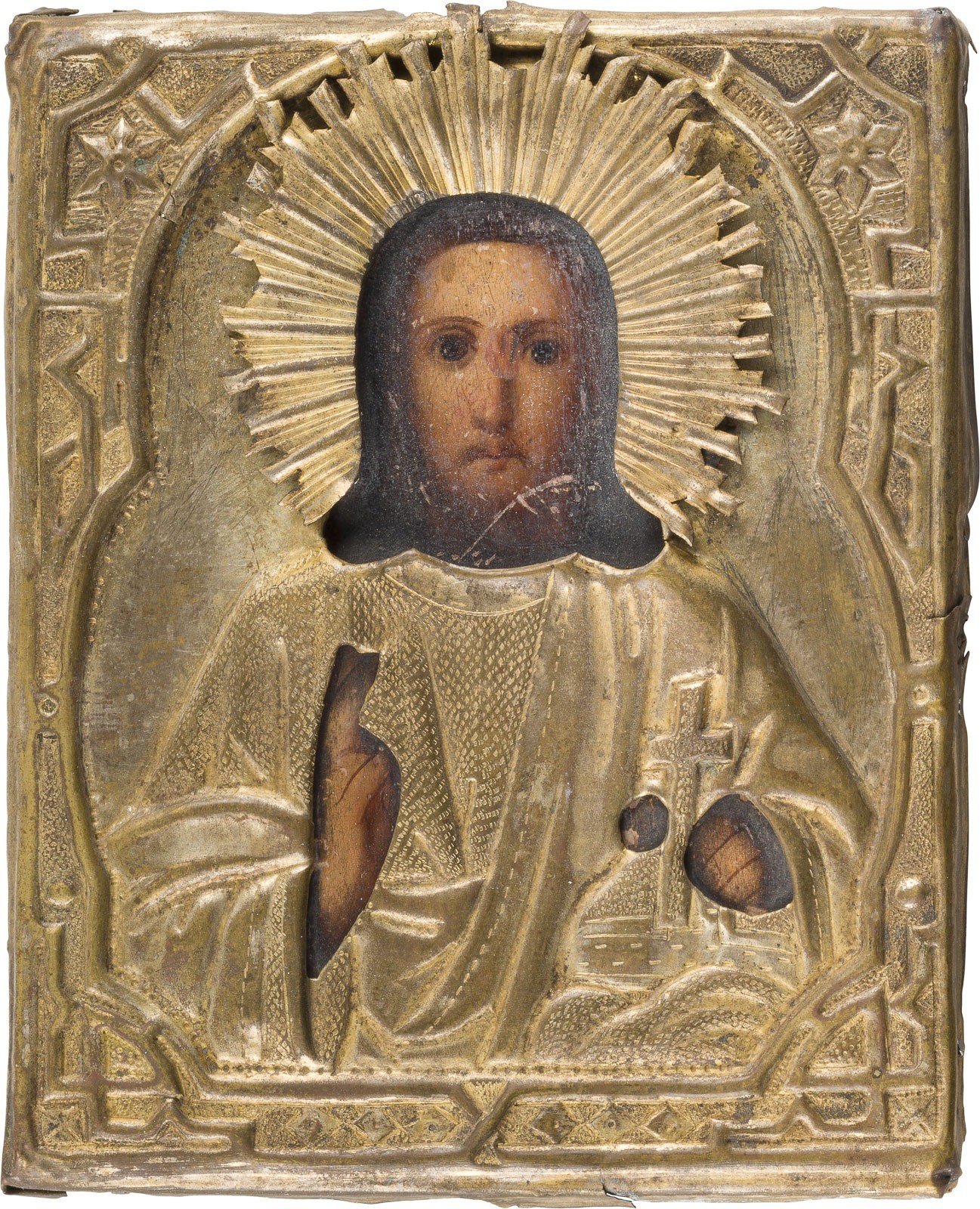 THREE ICONS SHOWING CHRIST PANTOKRATOR, THE MOTHER OF GOD 'UNEXPECTED JOY' AND THE MOTHER OF GOD 'JOY TO ALL WHO GRIEVE' Russian, 19th century / circa 1900 Tempera / oil on wood panels. The brass oklads chased and engraved. Losses. 13.2-27 cm.
