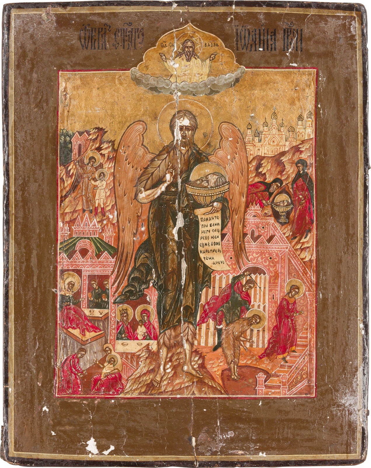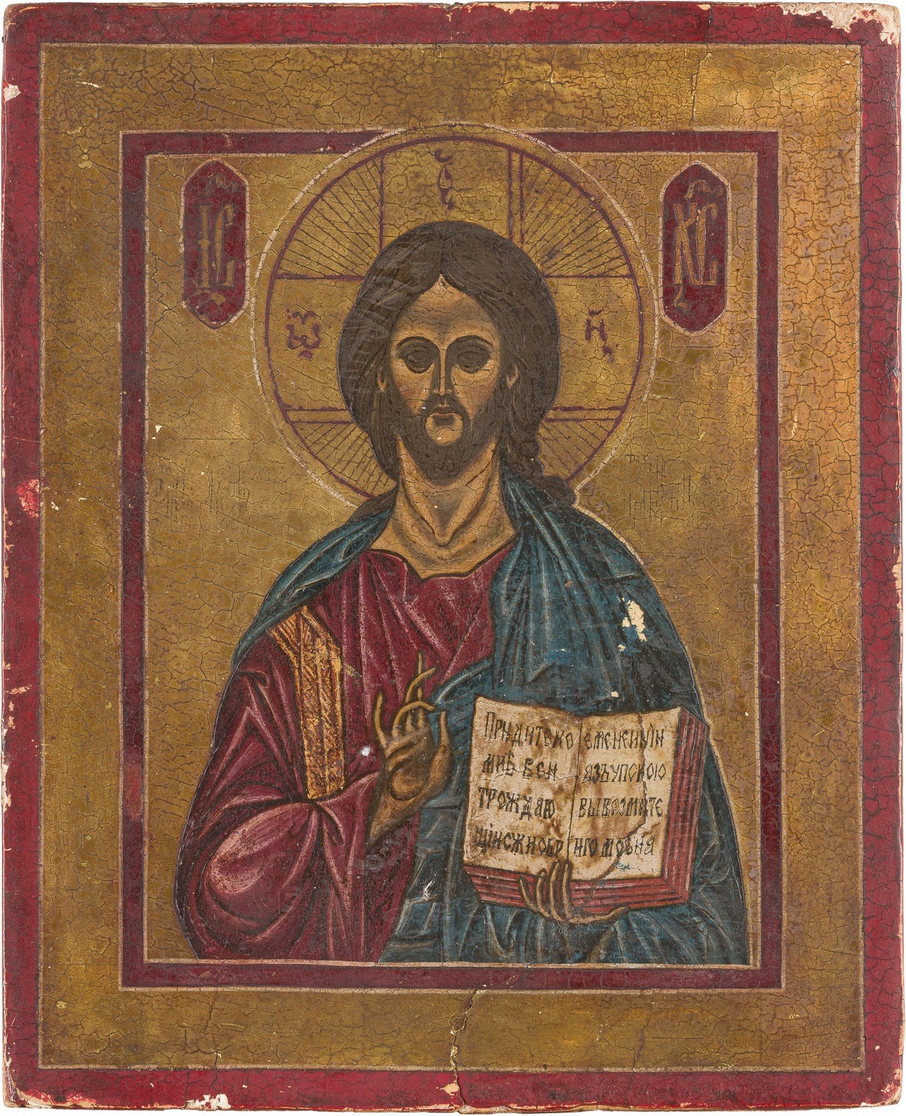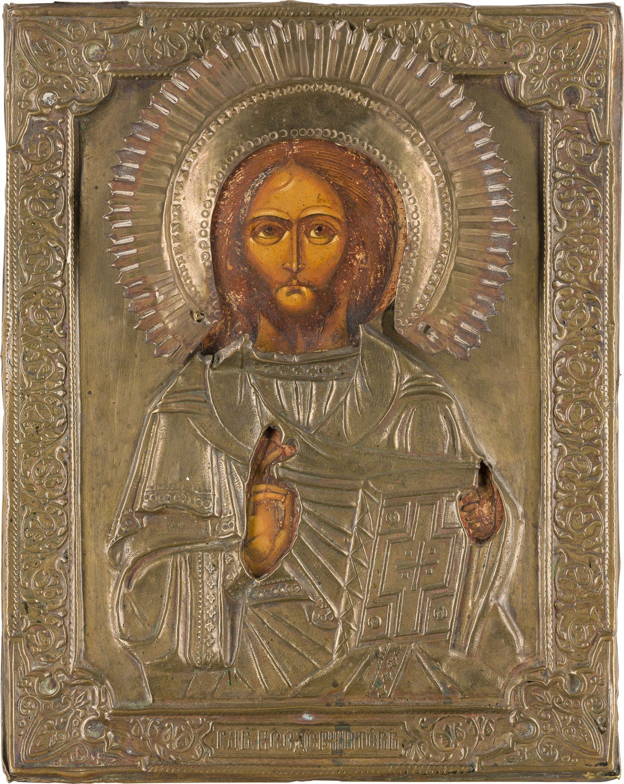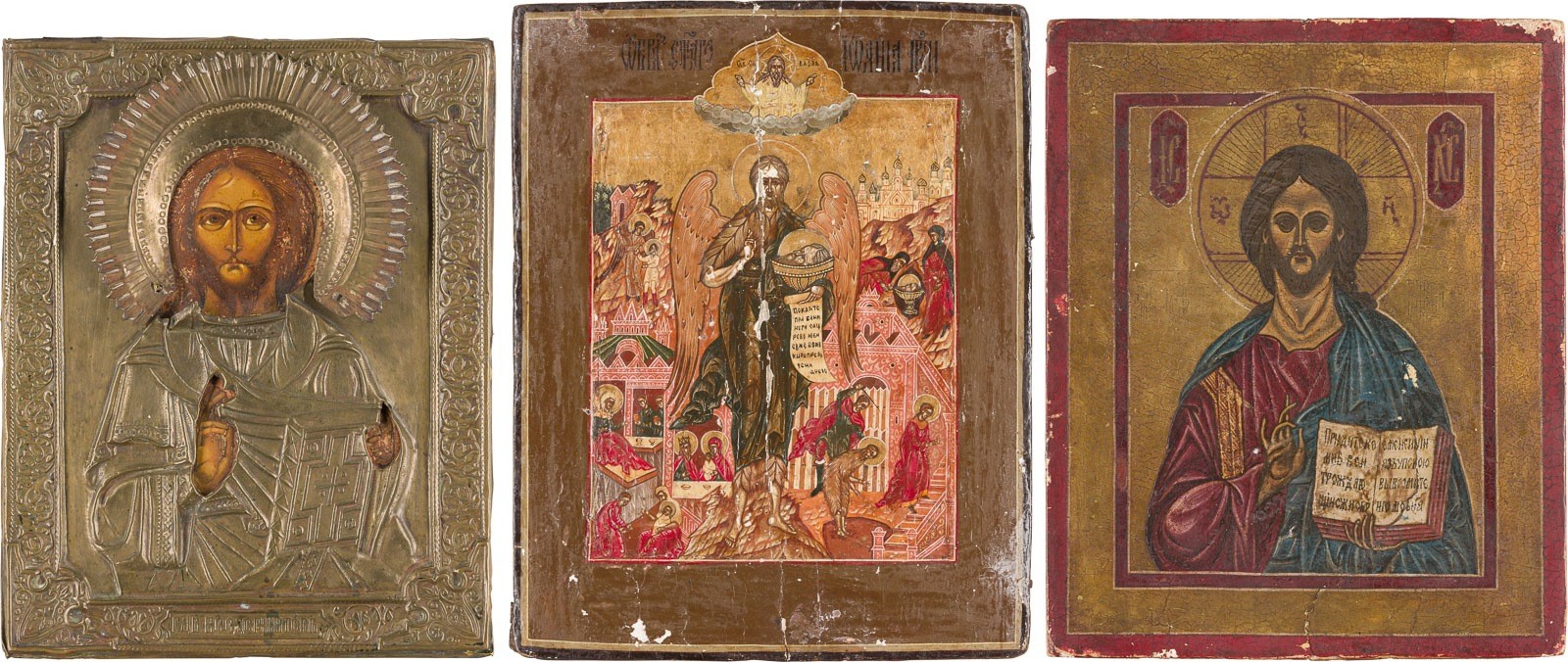 THREE ICONS SHOWING CHRIST PANTOKATOR AND ST. JOHN THE FORERUNNER Russian, 19th century / 2nd half of the 20th century Tempera on wood panels. The brass oklad chased and repoussé. Paint blisterings, losses, restored. 22.4-31.3 cm high.