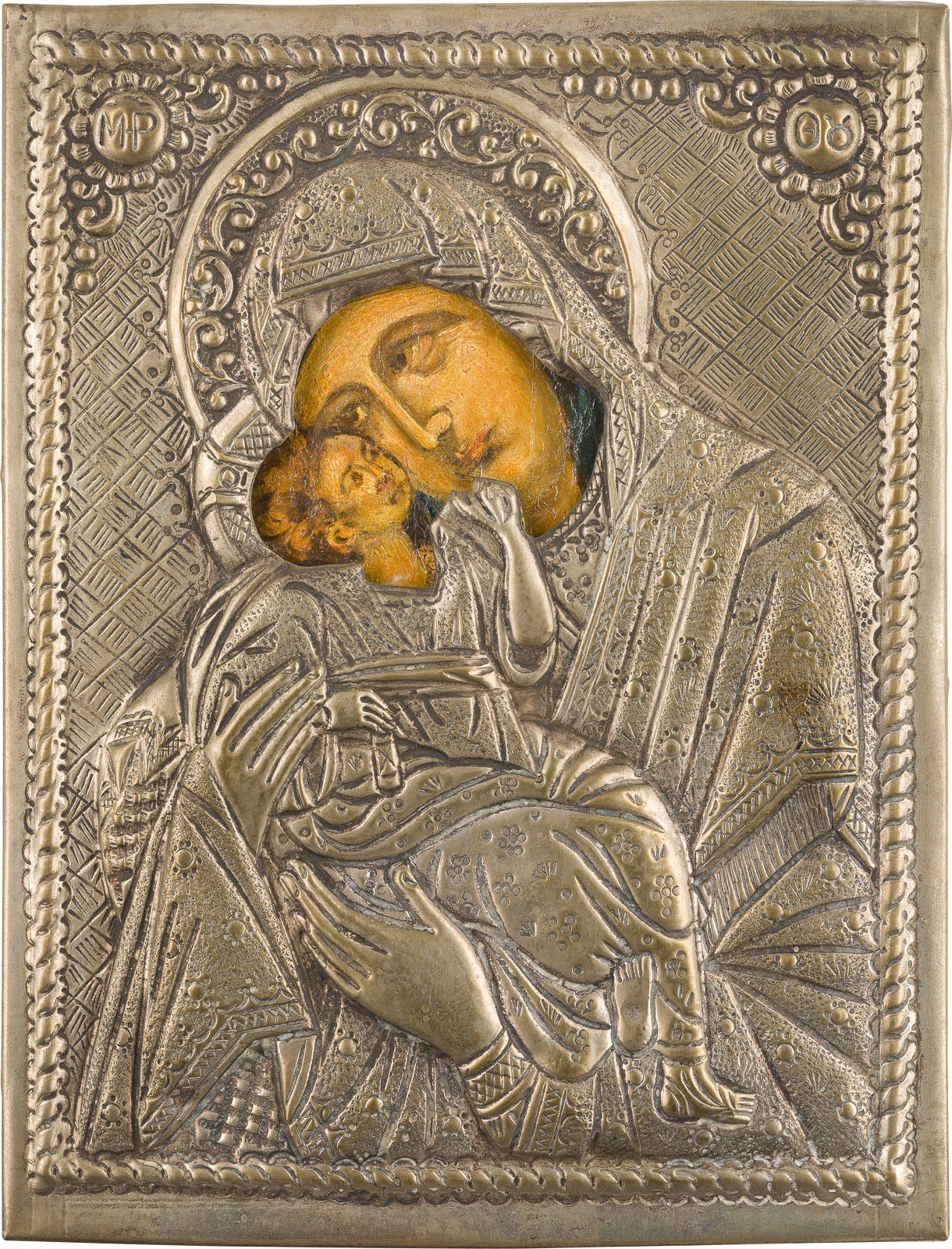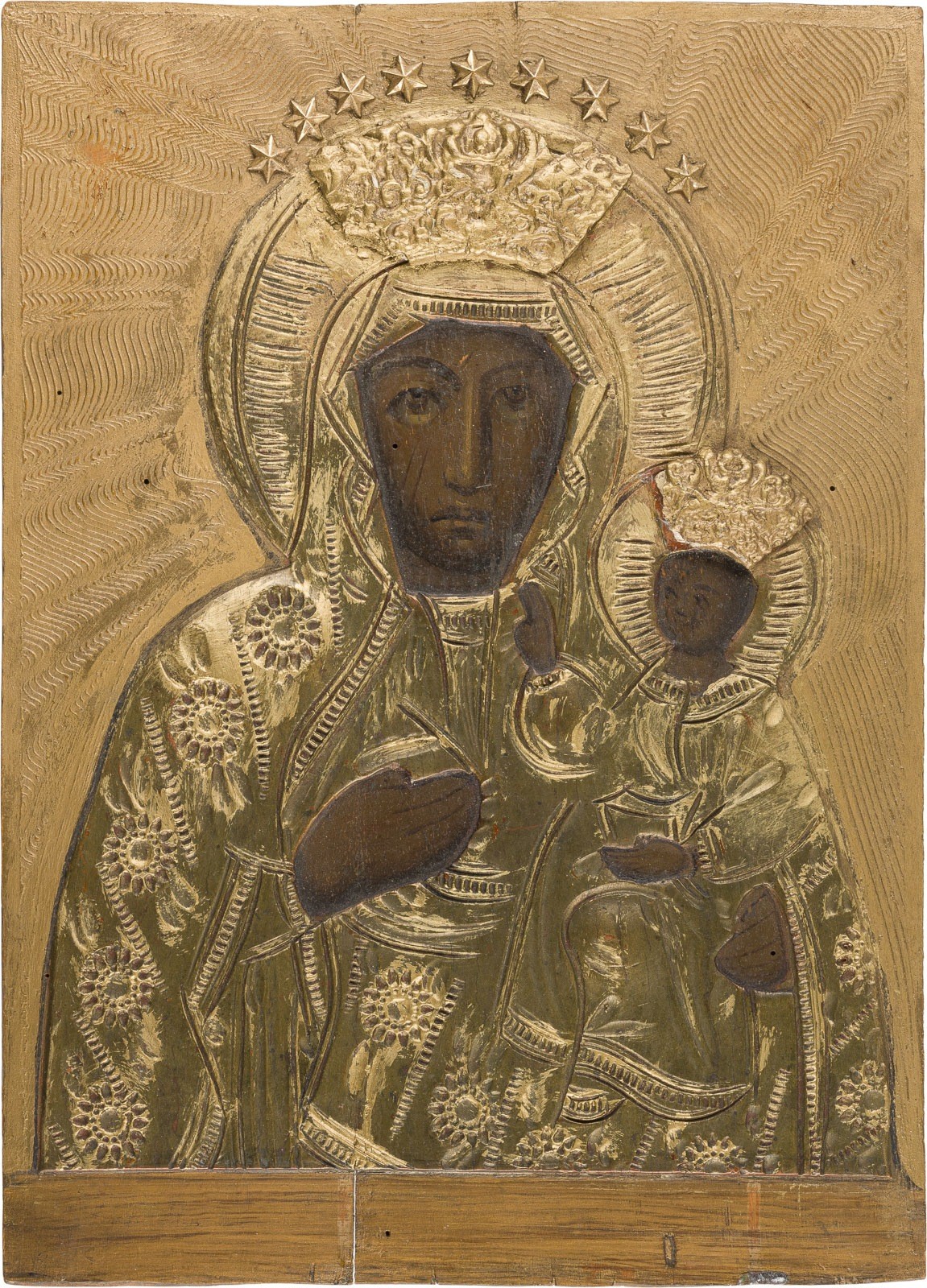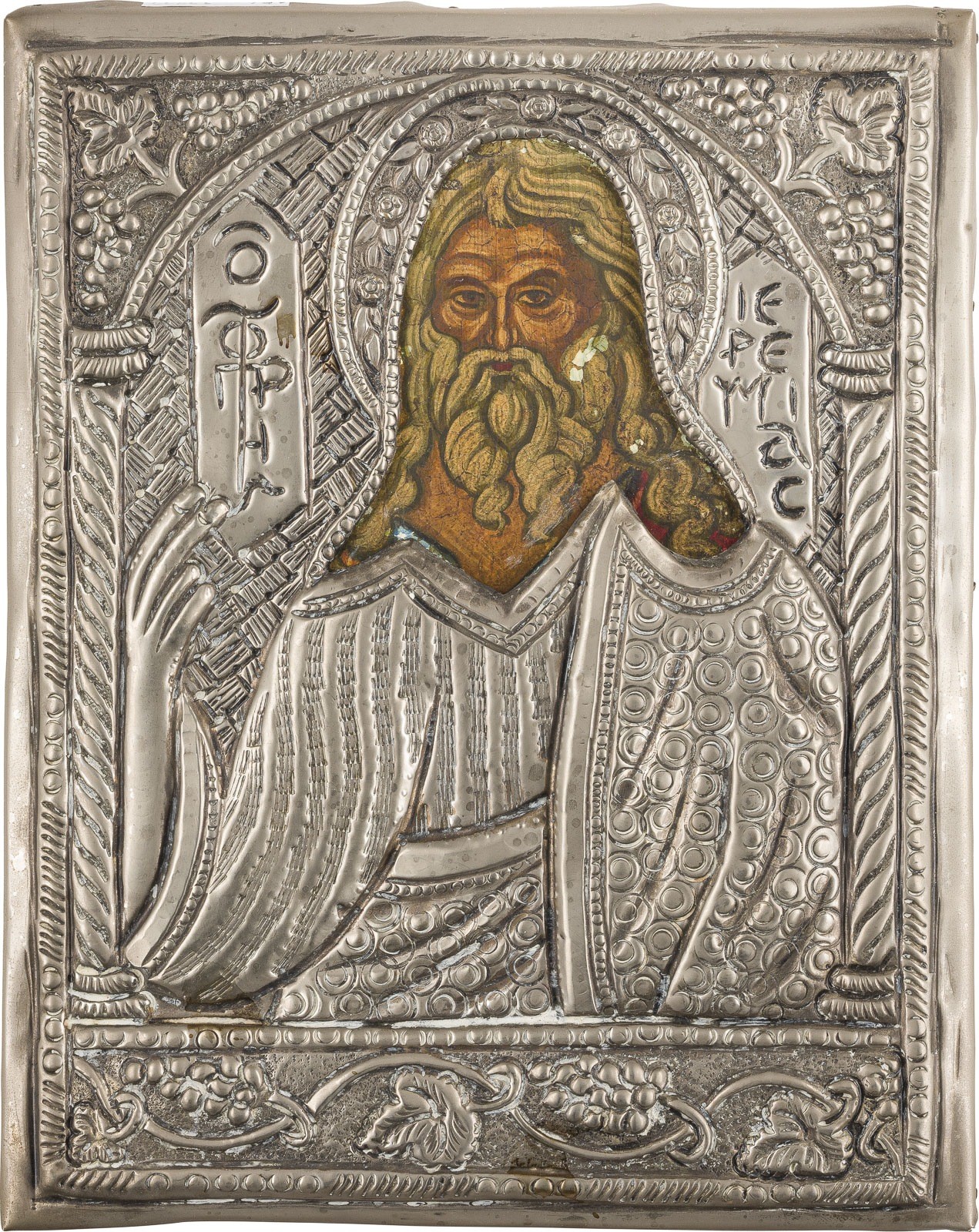 THREE ICONS SHOWING IMAGES OF THE MOTHER OF GOD AND ST. JEREMIAH Circa 1900 / recent Oil on wood panels, gilded background, metal oklads. Minor losses. 21-34.5 cm high.