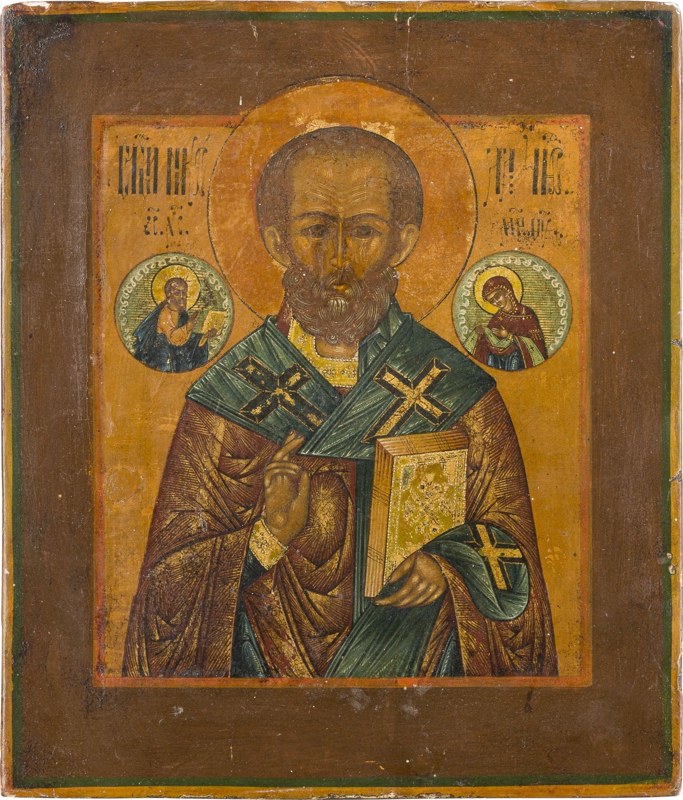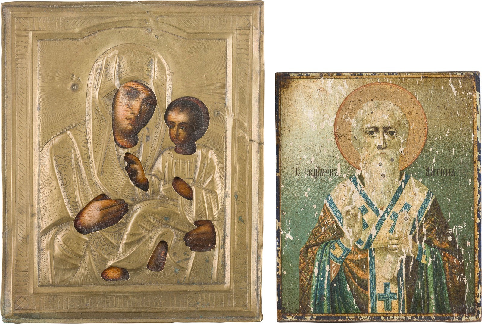 THREE ICONS SHOWING THE TIKHVINSKAYA MOTHER OF GOD, ST. ANTIPAS UND ST. NICHOLAS OF MYRA Russian, late 19th century Tempera / oil on wood panels / chromolithograph printed on paper. Partially restored. 13.8-35.7 cm high.
