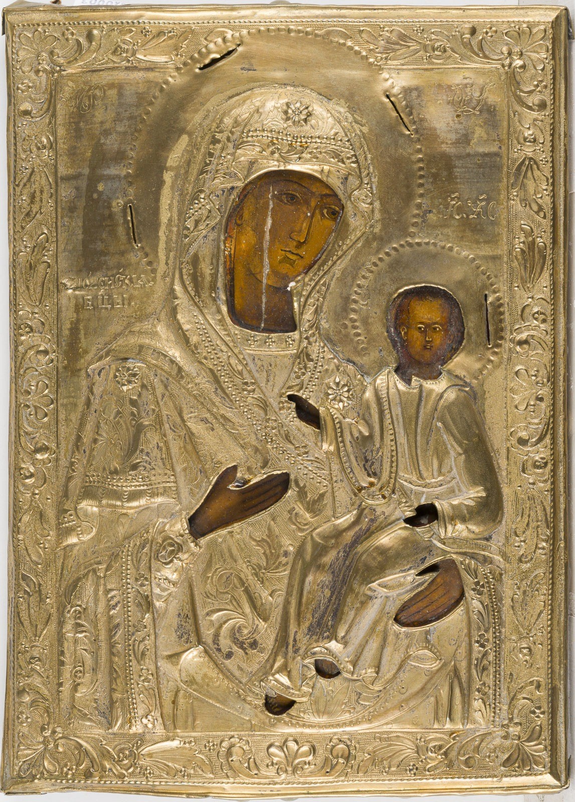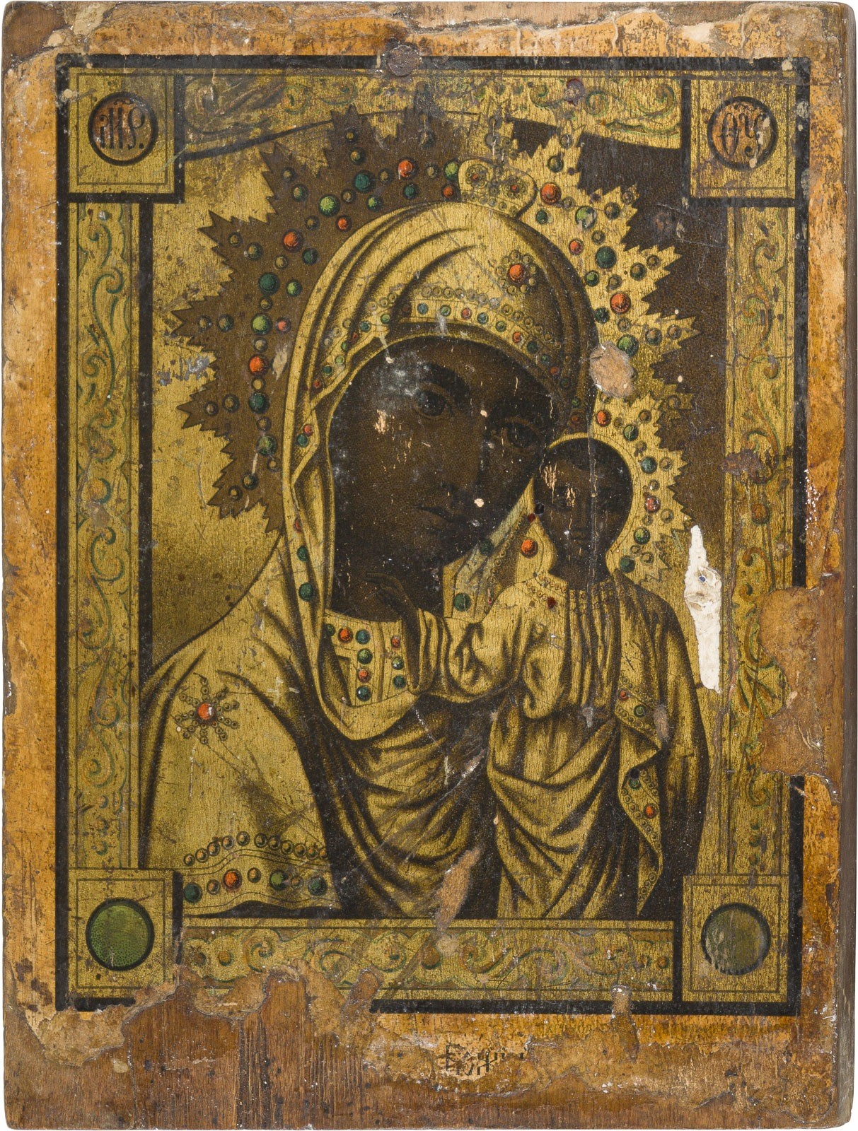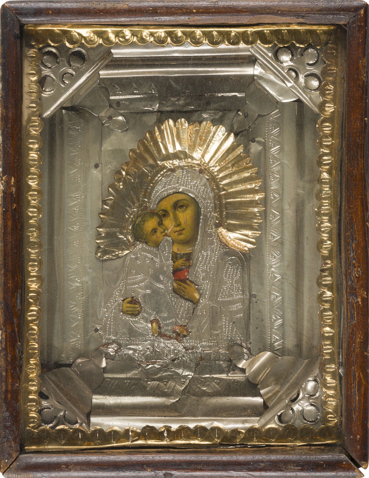 THREE ICONS WITH MIRACLE-WORKING IMAGES OF THE MOTHER OF GOD Russian, 19th century Tempera on wood panels / polychrome transfer print on paper mounted on wood. Brass oklad with repoussé decoration. Heights 17.6-29.3 cm. Some wear, losses.