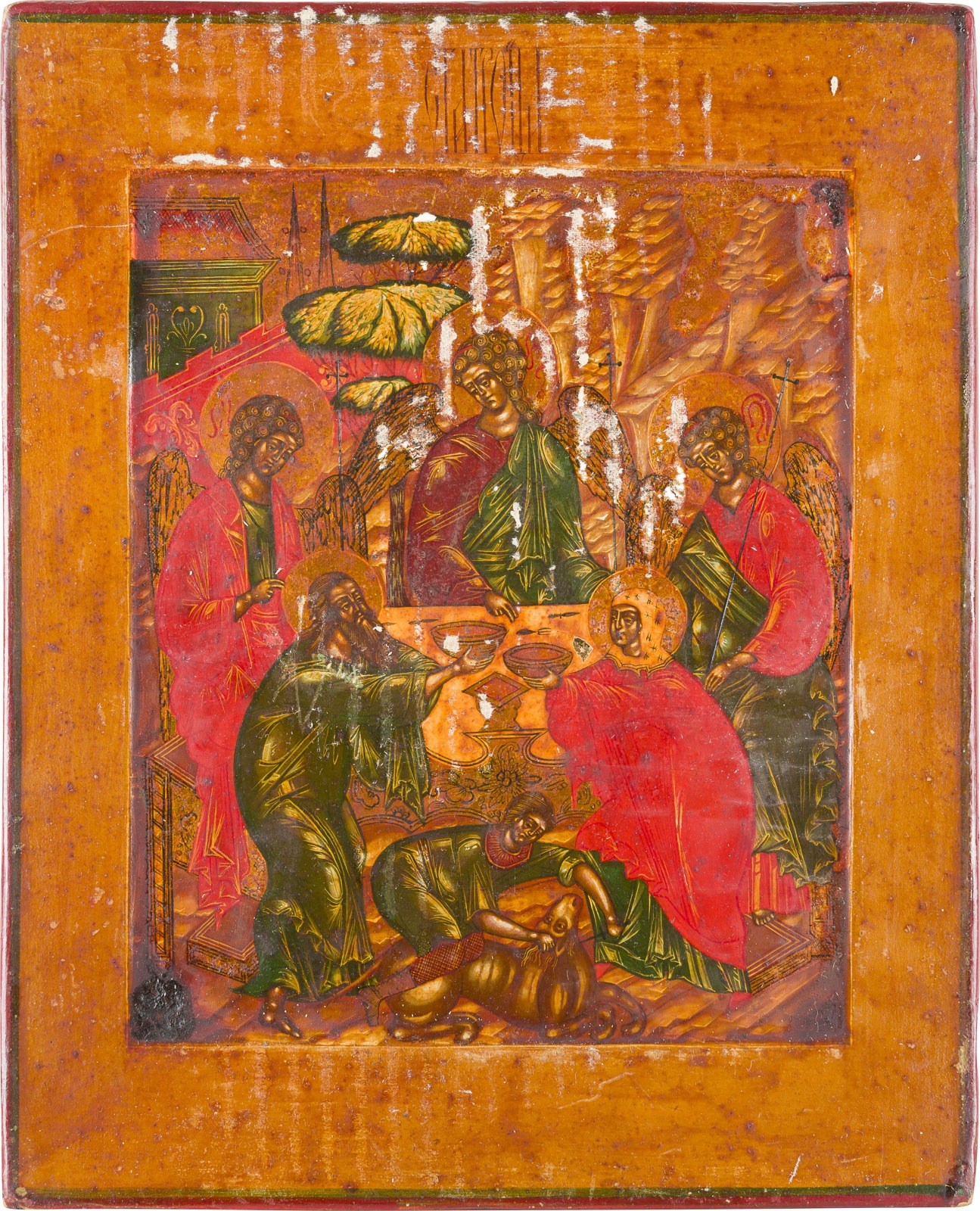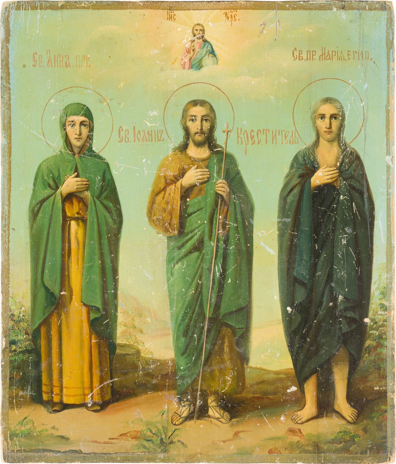 DREI IKONEN: PATRONATSIKONE MIT DEN HEILIGEN ANNA, JOHANNES DEM VORLÄUFER UND MARIA VON ÄGYPTEN, NIKOLAUS VON MYRA UND ALTTESTAMENTLICHE DREIFALTIGKEIT