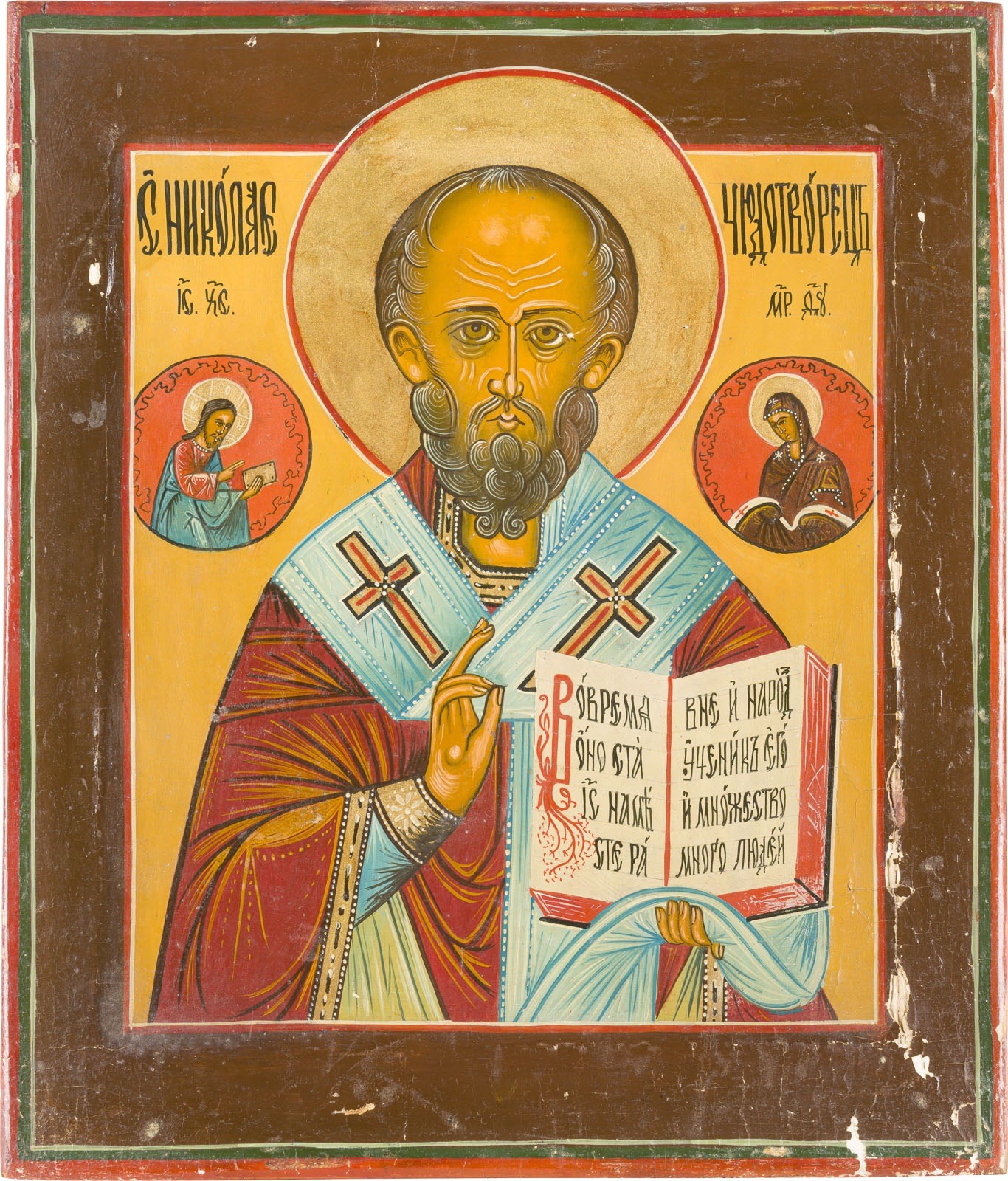 THREE ICONS: A PATRONAL ICON SHOWING STS. ANNA, JOHN THE FORERUNNER AND MARY OF EGYPT, ST. NICHOLAS OF MYRA AND THE OLD TESTAMENT TRINITY Russian, 19th century / recent Tempera / oil on wood panels. Minor losses. 29.7-35.5 cm high.