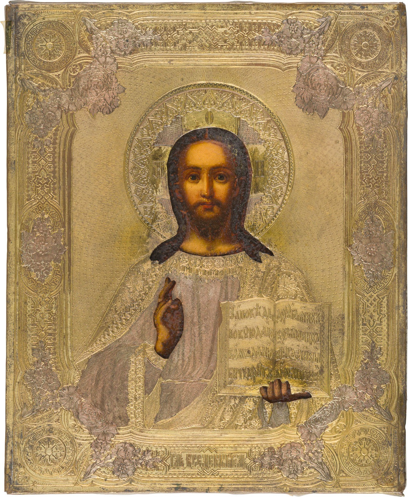 THREE SMALL ICONS SHOWING THE ANASTASIS, STS. PETER AND PAUL THE APOSTLES AND CHRIST PANTOKRATOR WITH OKLAD Russian, late 19th century Tempera on wood panels, the background made of silver, covered by a golden lacquer. The background and border incised to resemble a chased gilded silver oklad / oil on wood panel with fabric backing. Losses. 17.2-22.1 cm high.