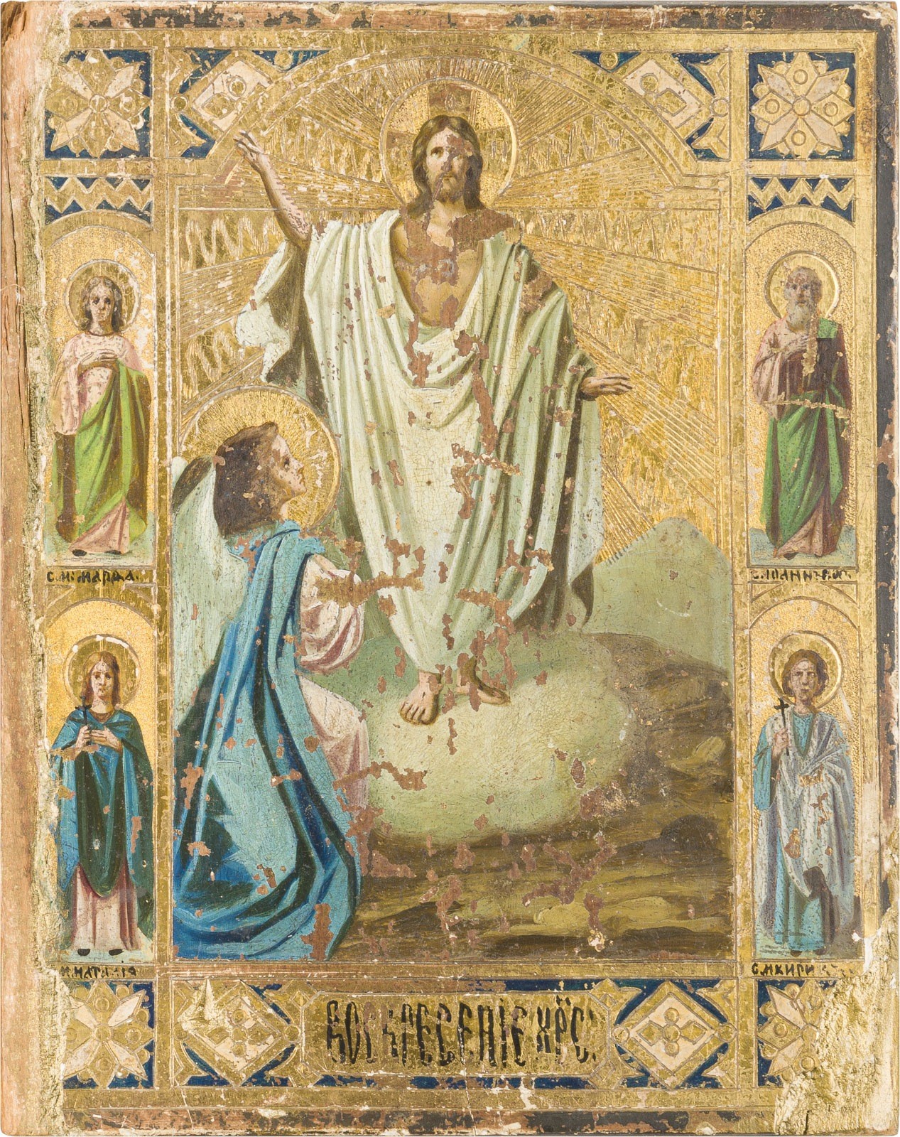 DREI KLEINE IKONEN: AUFERSTEHUNG, DIE APOSTEL PETRUS UND PAULUS UND CHRISTUS PANTOKRATOR MIT OKLAD