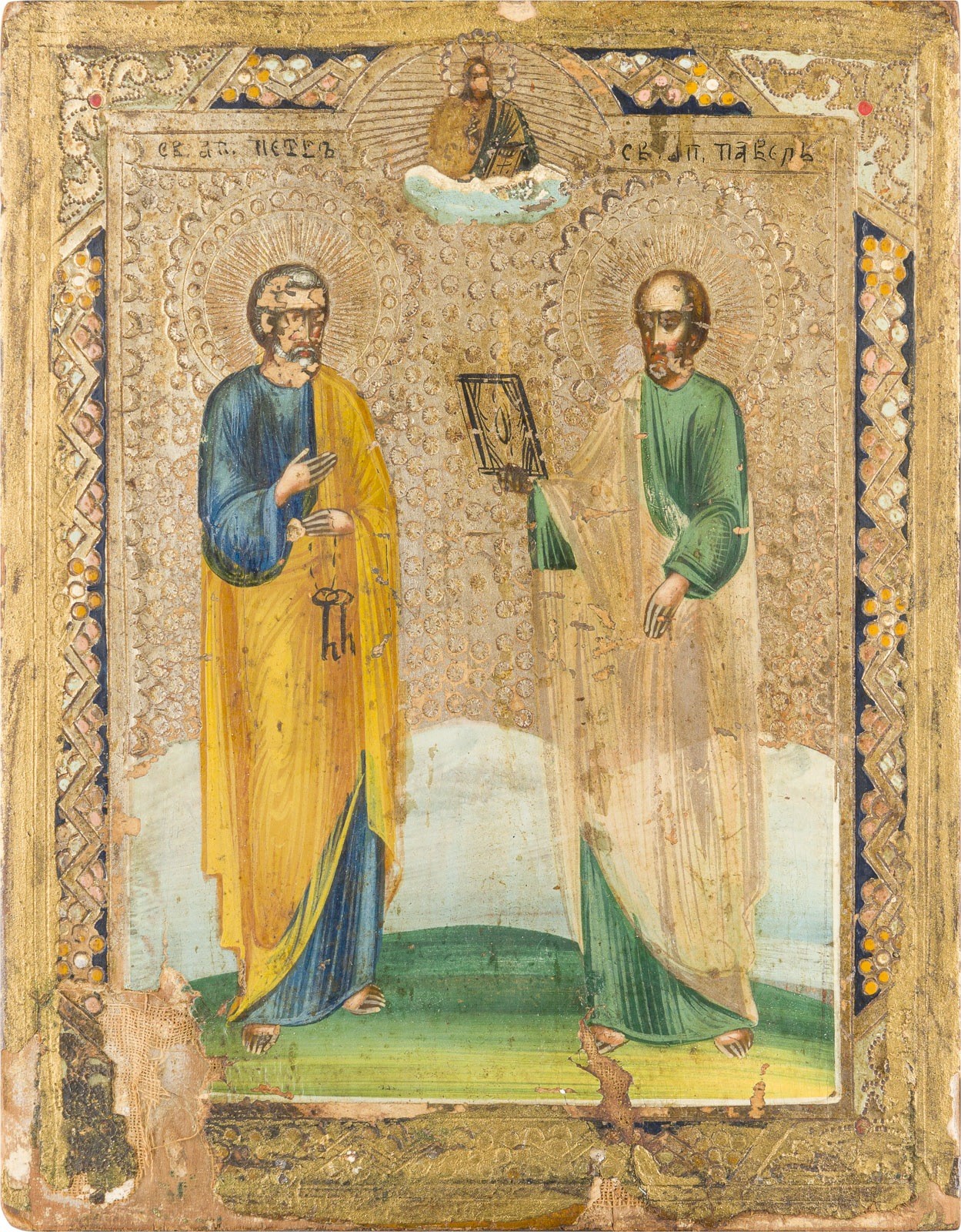 THREE SMALL ICONS SHOWING THE ANASTASIS, STS. PETER AND PAUL THE APOSTLES AND CHRIST PANTOKRATOR WITH OKLAD Russian, late 19th century Tempera on wood panels, the background made of silver, covered by a golden lacquer. The background and border incised to resemble a chased gilded silver oklad / oil on wood panel with fabric backing. Losses. 17.2-22.1 cm high.