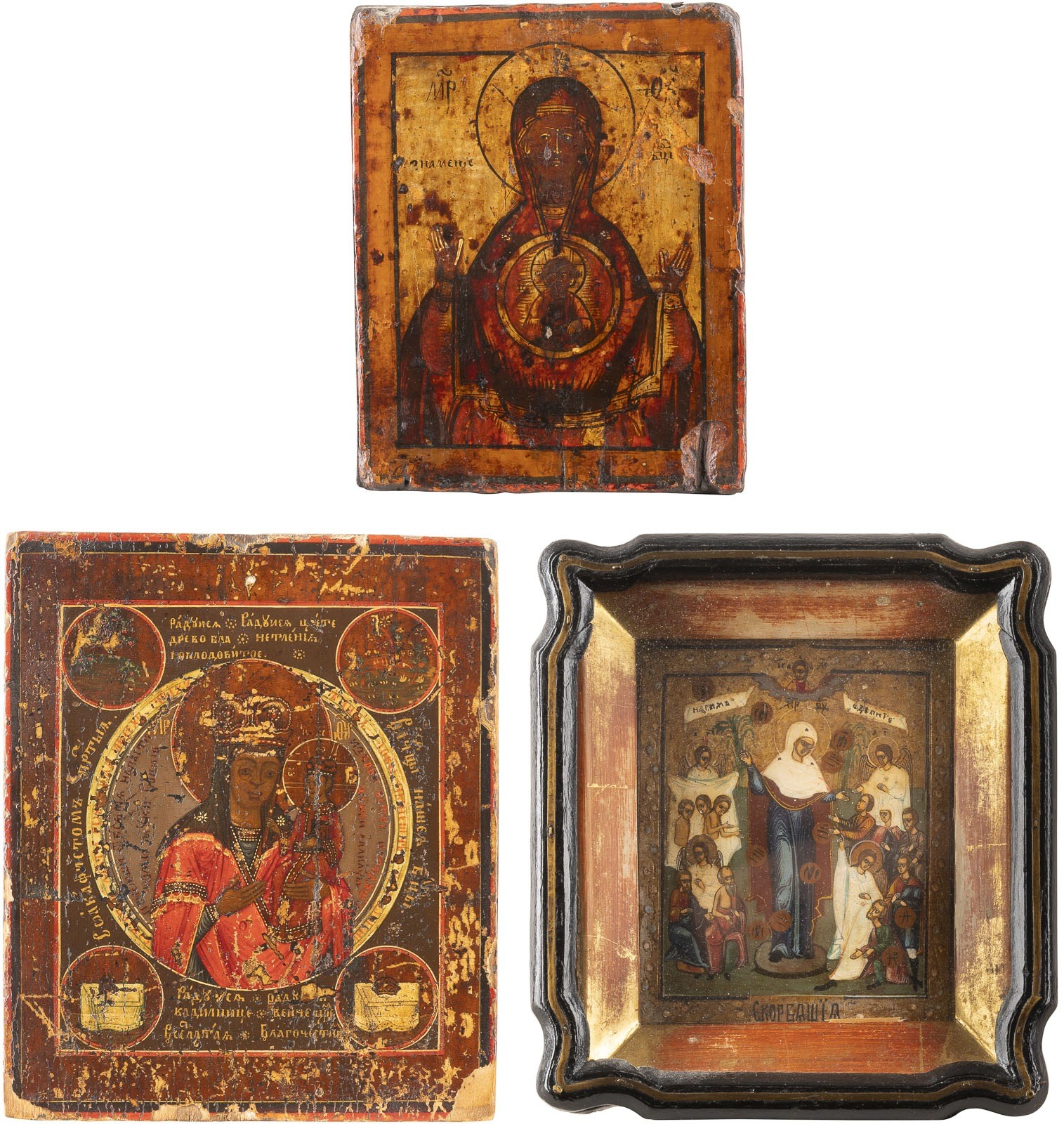 THREE SMALL ICONS SHOWING IMAGES OF THE MOTHER OF GOD Russian, 19th century Tempera on wood panels. The background made of silver, covered by a golden lacquer. Losses. 16.2-19 cm high (with glazed kyot).